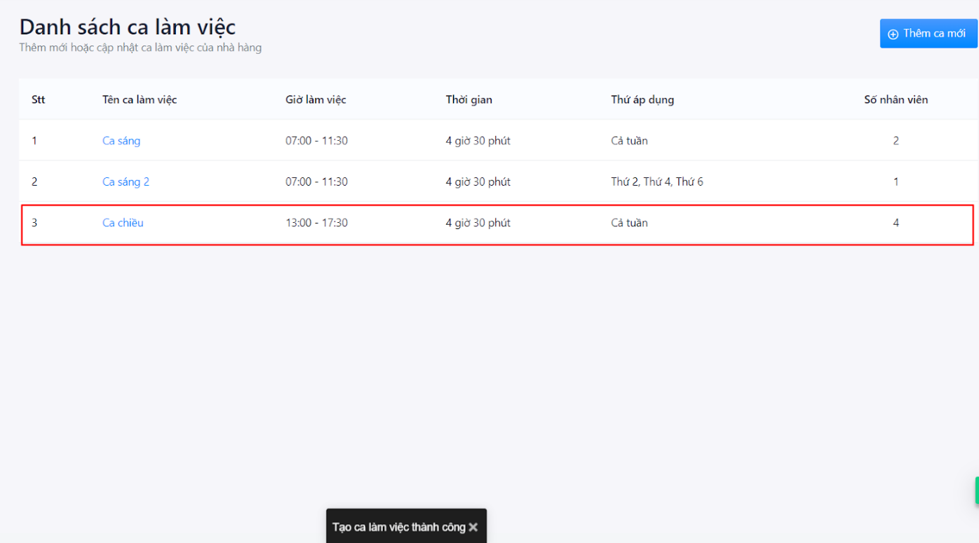 | Tên ca* | Nhập tên ca làm việc, ví dụ: "Ca sáng", "Ca 1" để dễ phân biệt các ca làm việc khác nhau. |