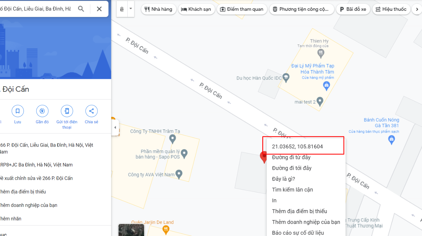 Nếu địa chỉ chấm công của bạn không có trong danh sách, bạn thực hiện lấy tọa độ từ google maps như sau: