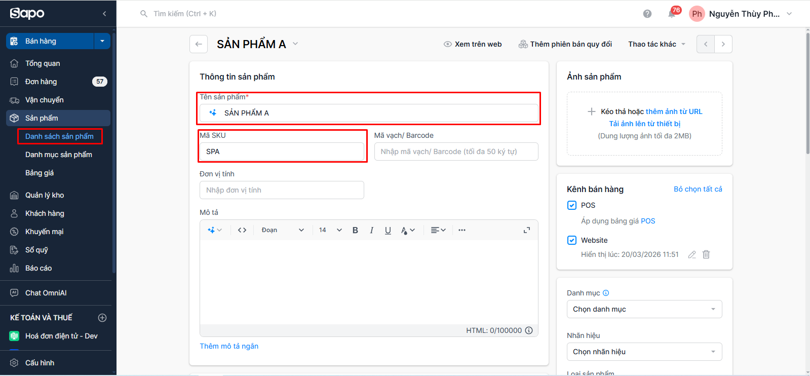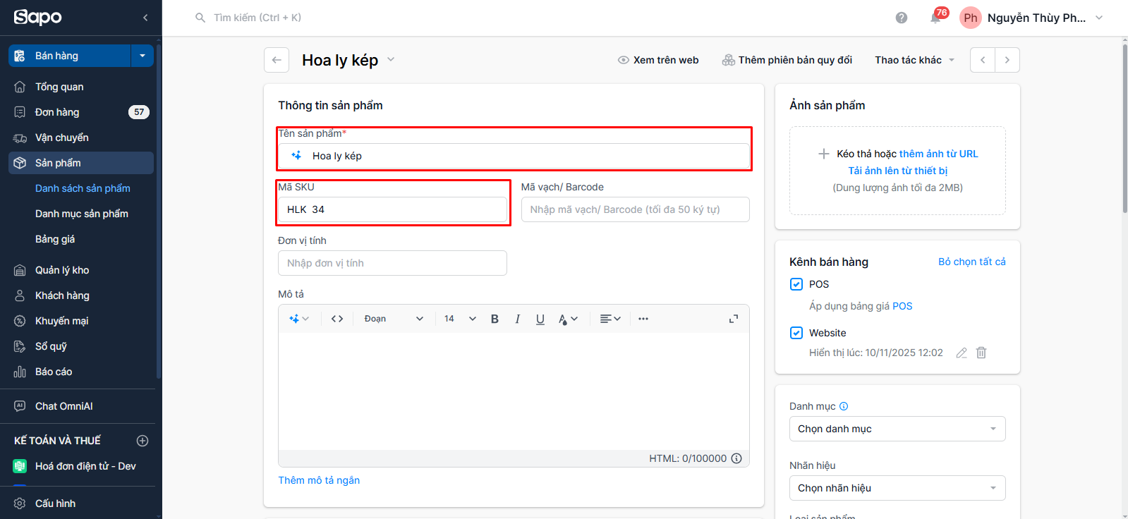 - Tên sản phẩm trên hóa đơn điện tử*: Nhập tên bạn muốn hiển thị trên hóa đơn điện tử.