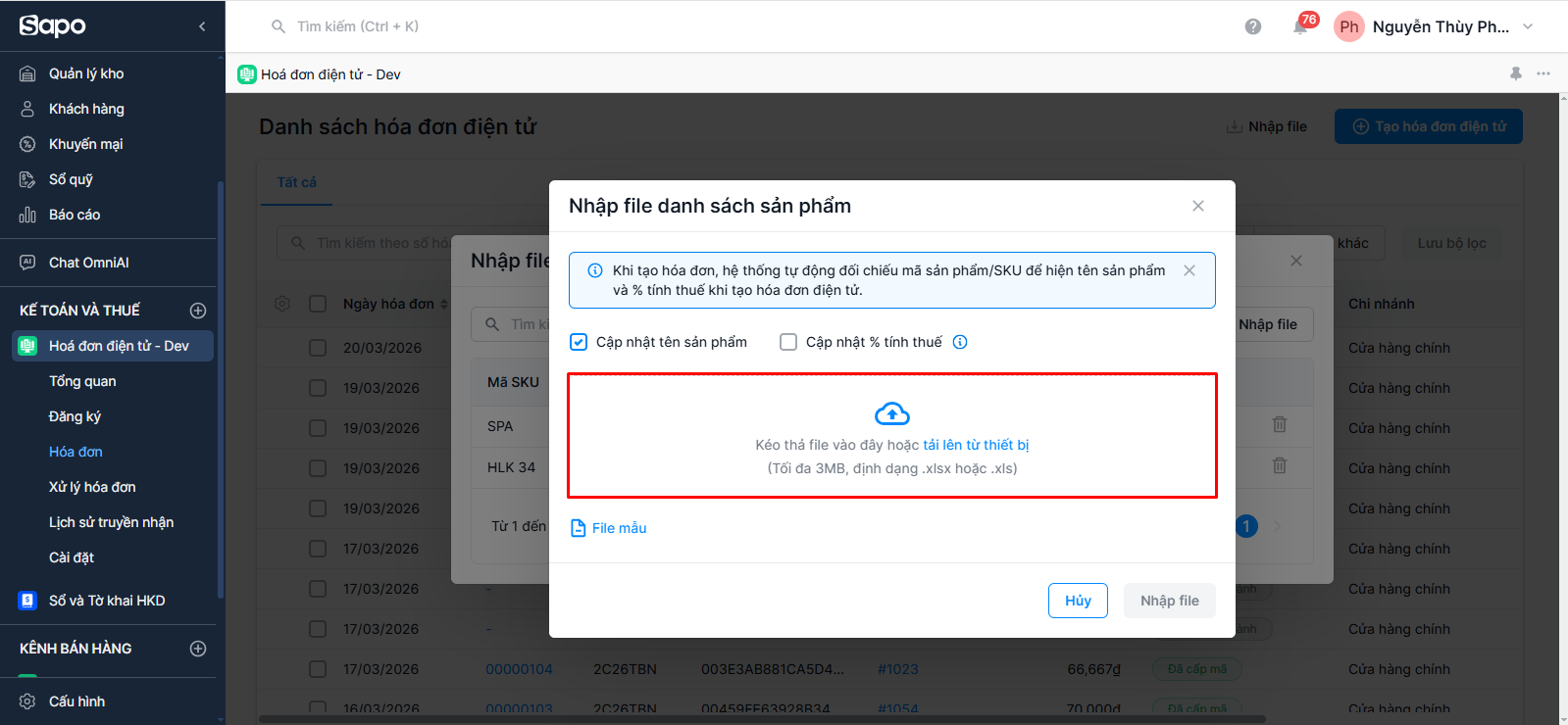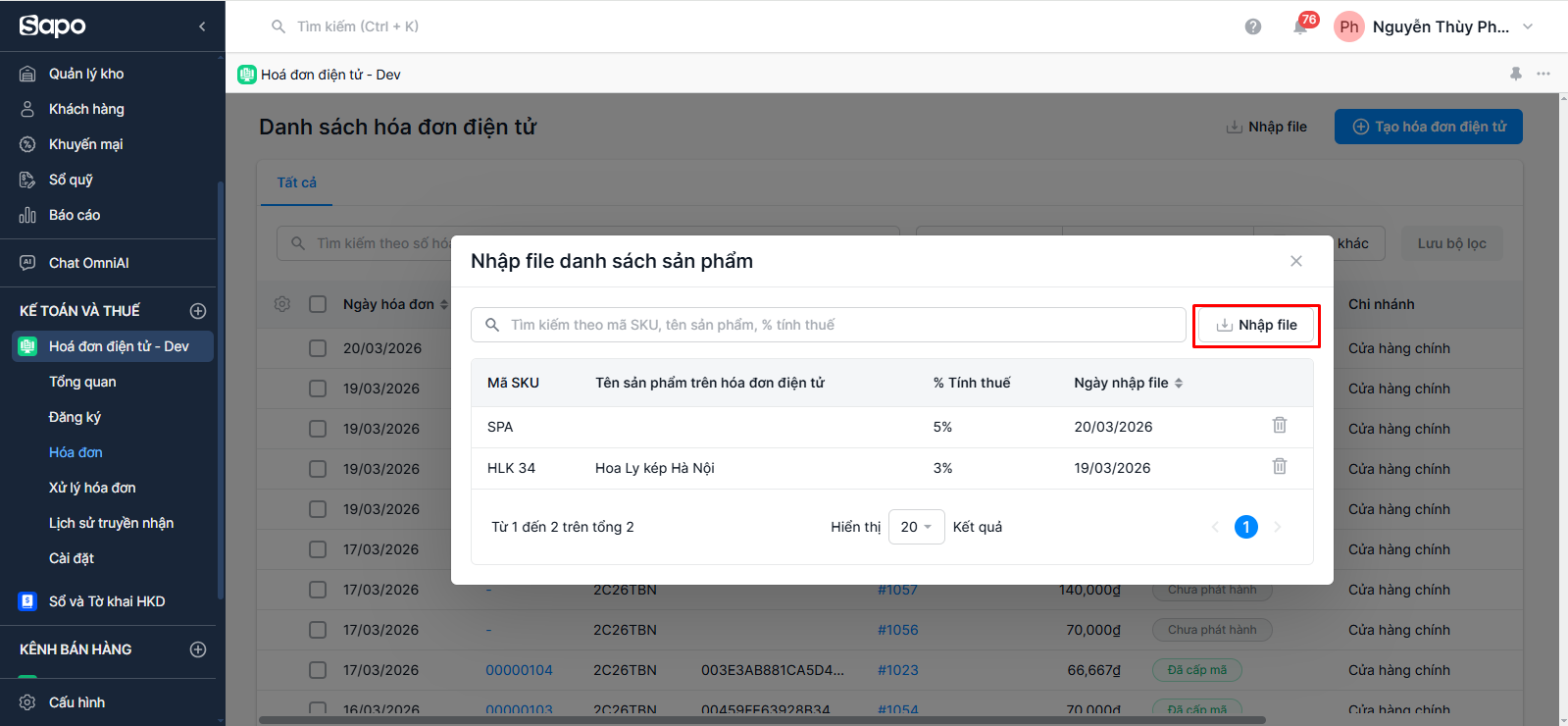 - Sau khi đã file dữ liệu hoàn tất tải lên, bạn nhấn nút Nhập file. Hệ thống hiển thị thông báo Nhập file hóa đơn thành công, dữ liệu sẽ được xử lý và thông báo về email bạn đã đăng ký trên phần mềm Sapo OmniAI.