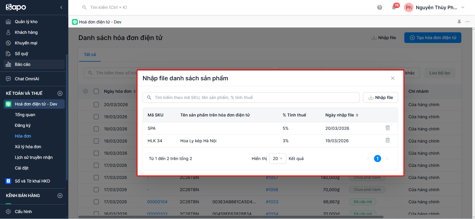 - Nếu hợp lệ: Sản phẩm sẽ được hiển thị trong màn hình Nhập file danh sách sản phẩm.