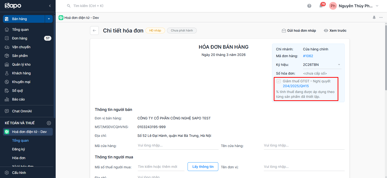 - Tính năng này chỉ áp dụng cho hóa đơn bán hàng giảm thuế GTGT theo Nghị quyết 204/2025/QH15.