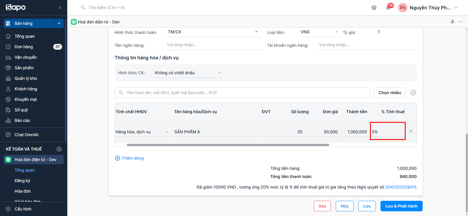 - Sản phẩm A được bán với mức thuế suất GTGT 5% và thuộc diện giảm thuế GTGT theo Nghị quyết 204/2025/QH15. Sau khi được thiết lập, tất cả các hóa đơn có chứa Sản phẩm A sẽ được tự đồng điền 5% ở mục % tính thuế và hóa đơn đó được mặc định tích chọn dòng Giảm thuế GTGT – Nghị quyết 204/2025/QH15.