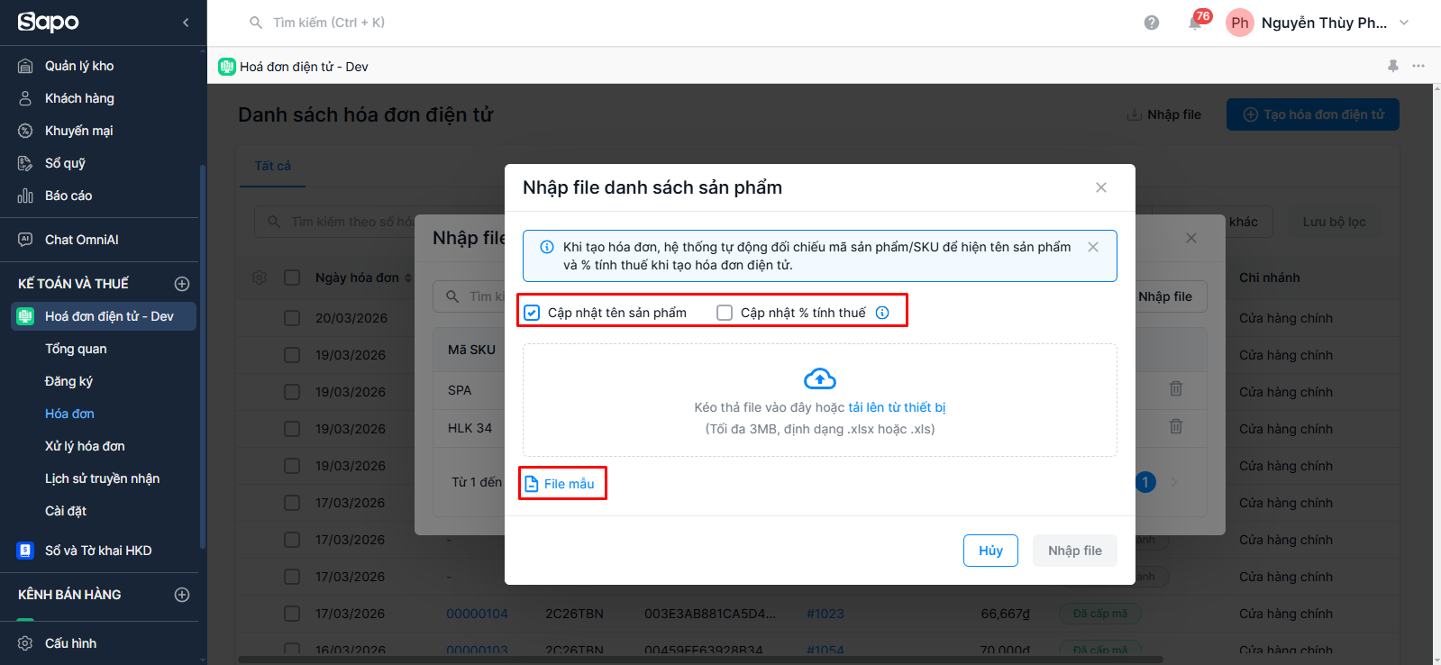 Trường hợp 3: Tích chọn Cập nhật tên sản phẩm và Cập nhật % tính thuế