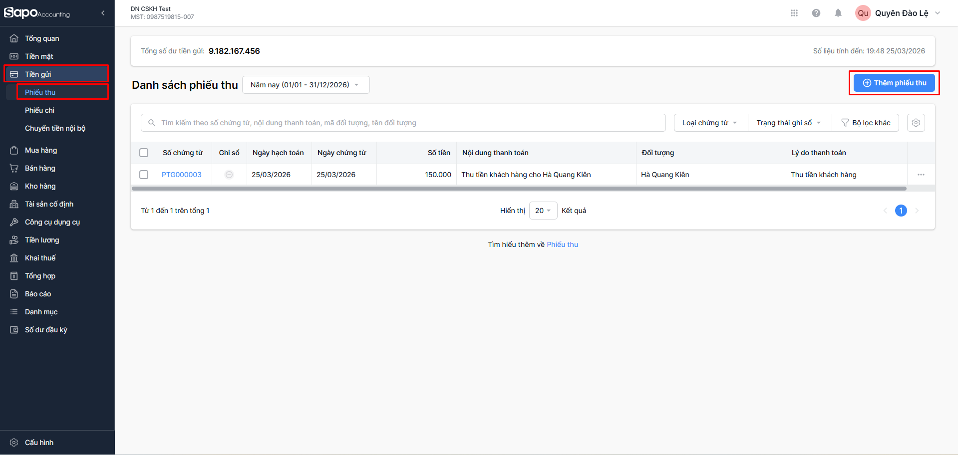 - Trên thanh Menu bên trái trang quản trị, chọn Tiền gửi > Phiếu thu, phần mềm sẽ điều hướng đến màn hình Danh sách Phiếu thu.