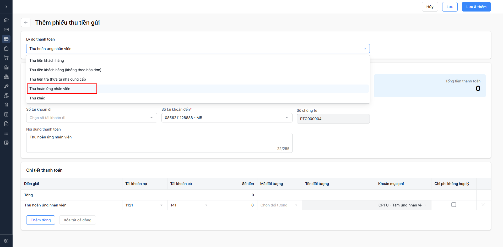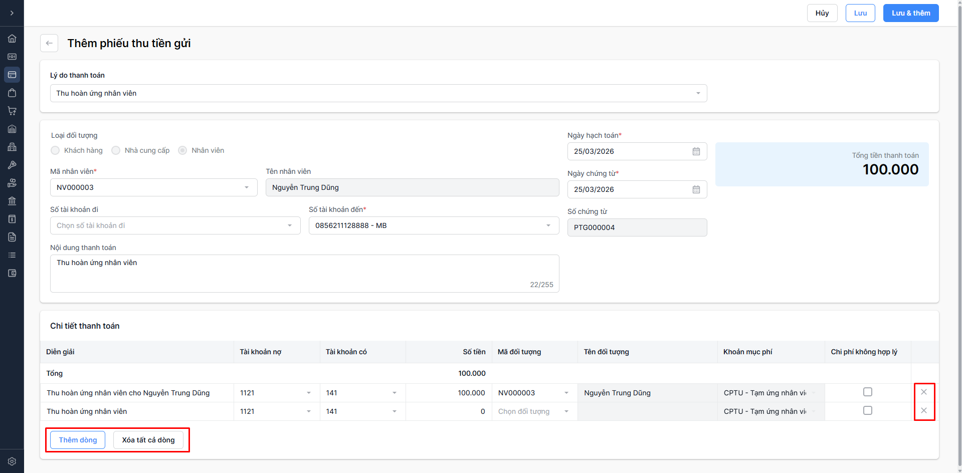 - Diễn giải: Diễn giải tự động điền theo quy tắc “Thu hoàn ứng nhân viên”