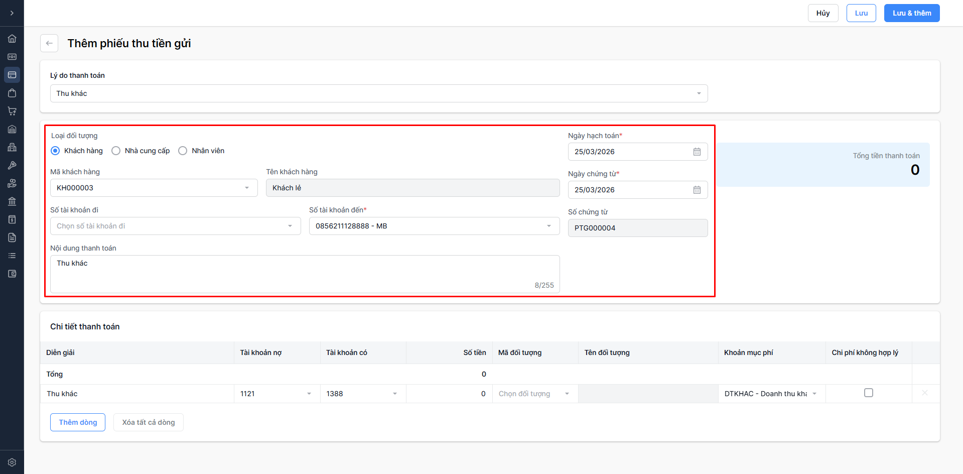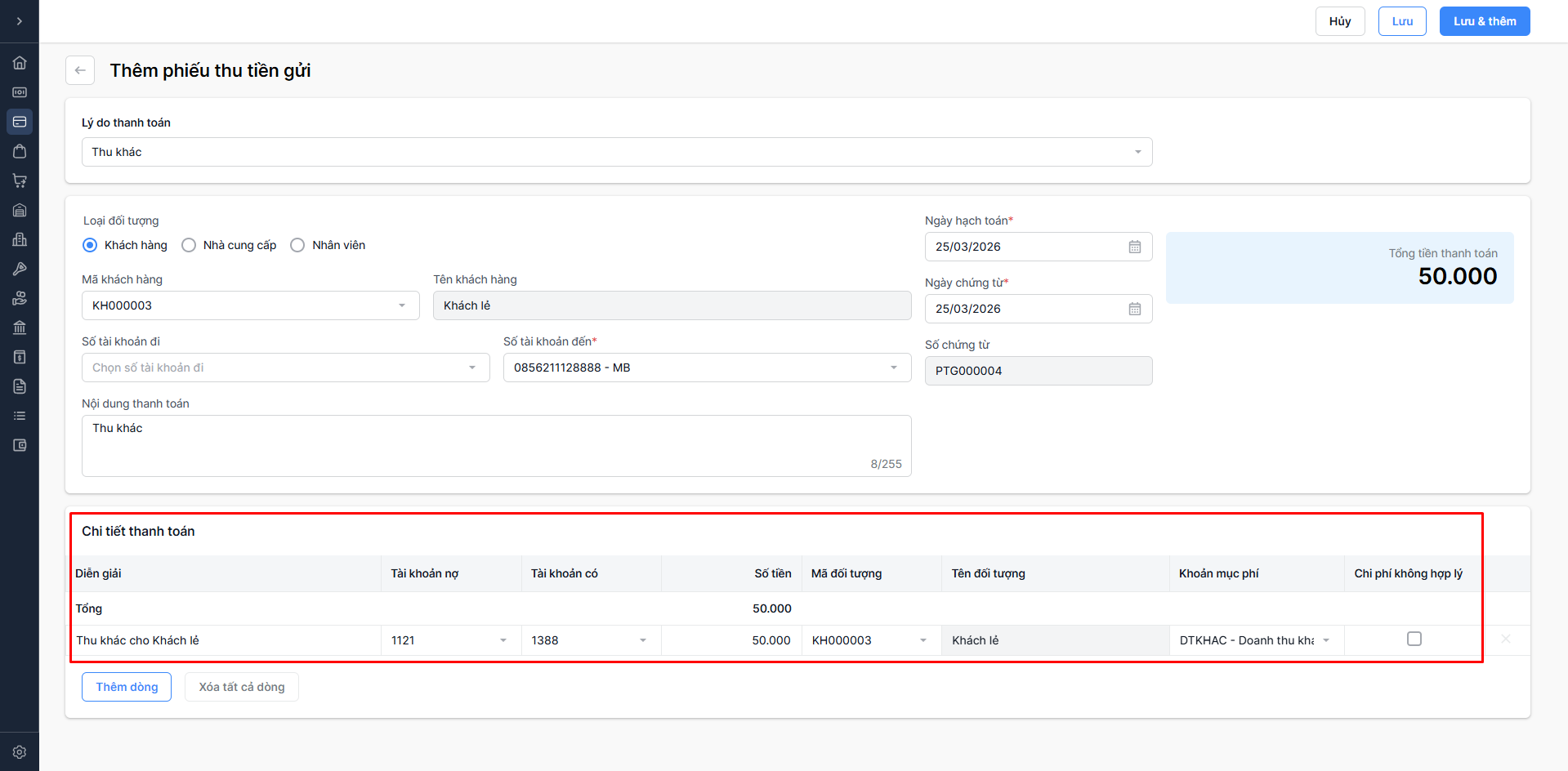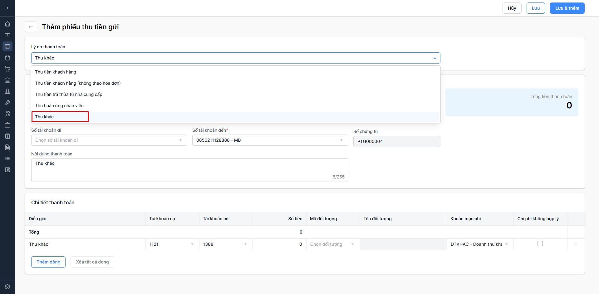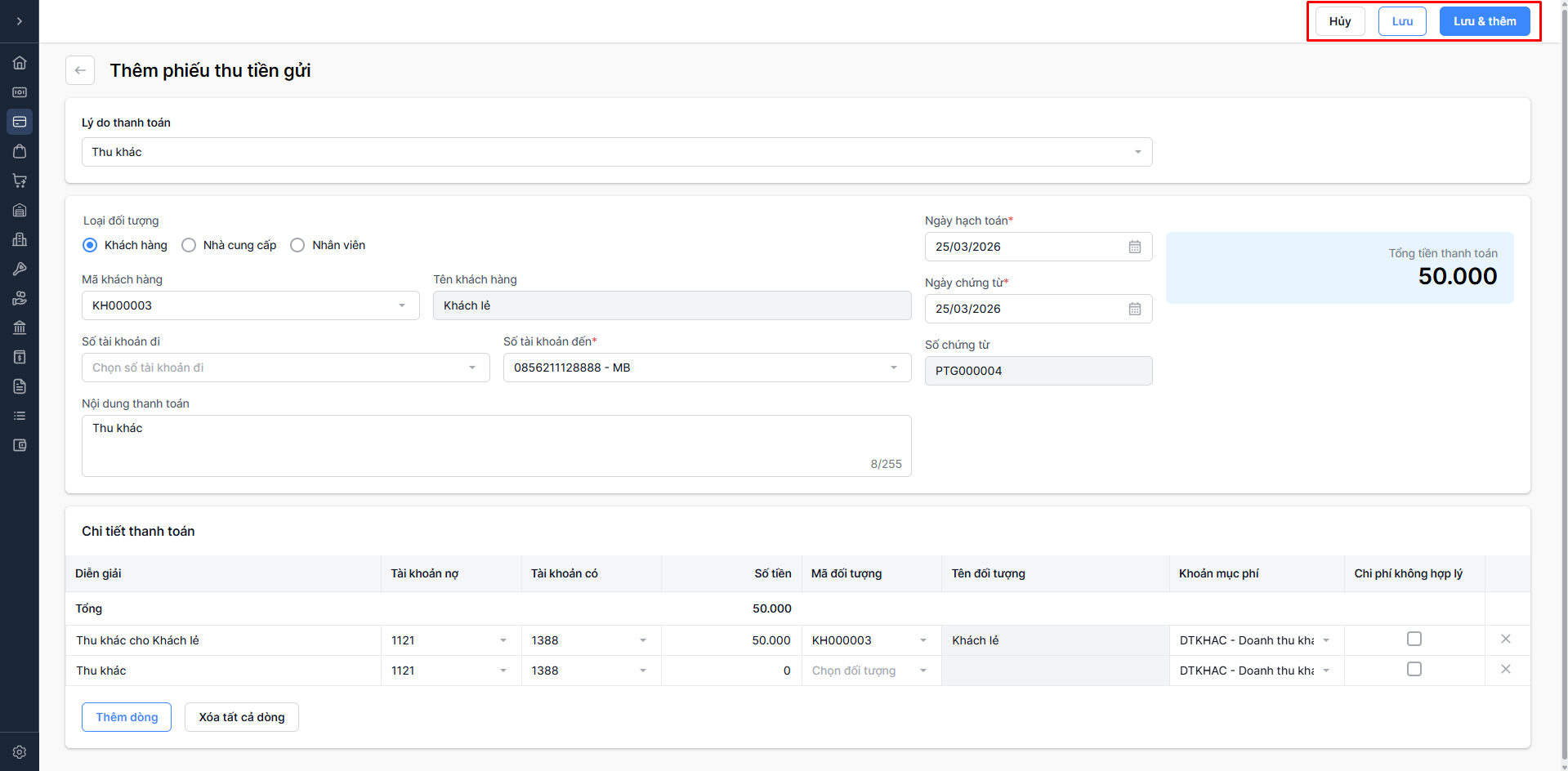 - Chọn Lưu & thêm: Lưu thông tin phiếu thu vừa nhập và tiếp tục thêm phiếu thu mới.