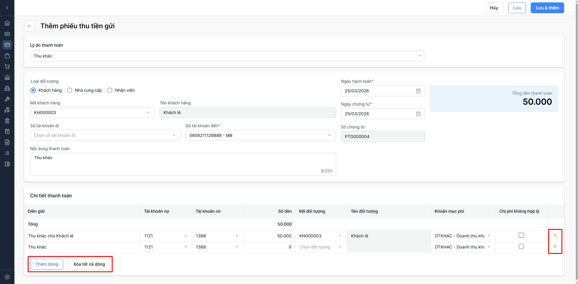 - Xóa tất cả dòng: Chỉ hiển thị khi có ít nhất 2 chứng từ nghiệp vụ thu tiền (ngoại trừ Chiết khấu thanh toán) để xoá tất cả số tiền thu bạn nhập liệu ở trên.