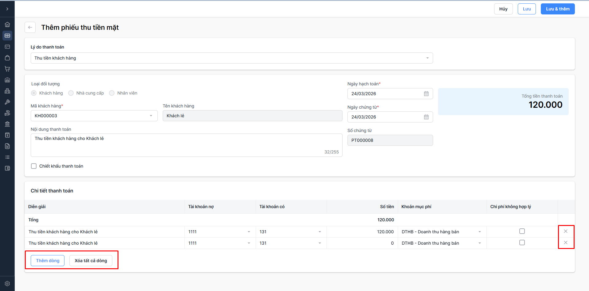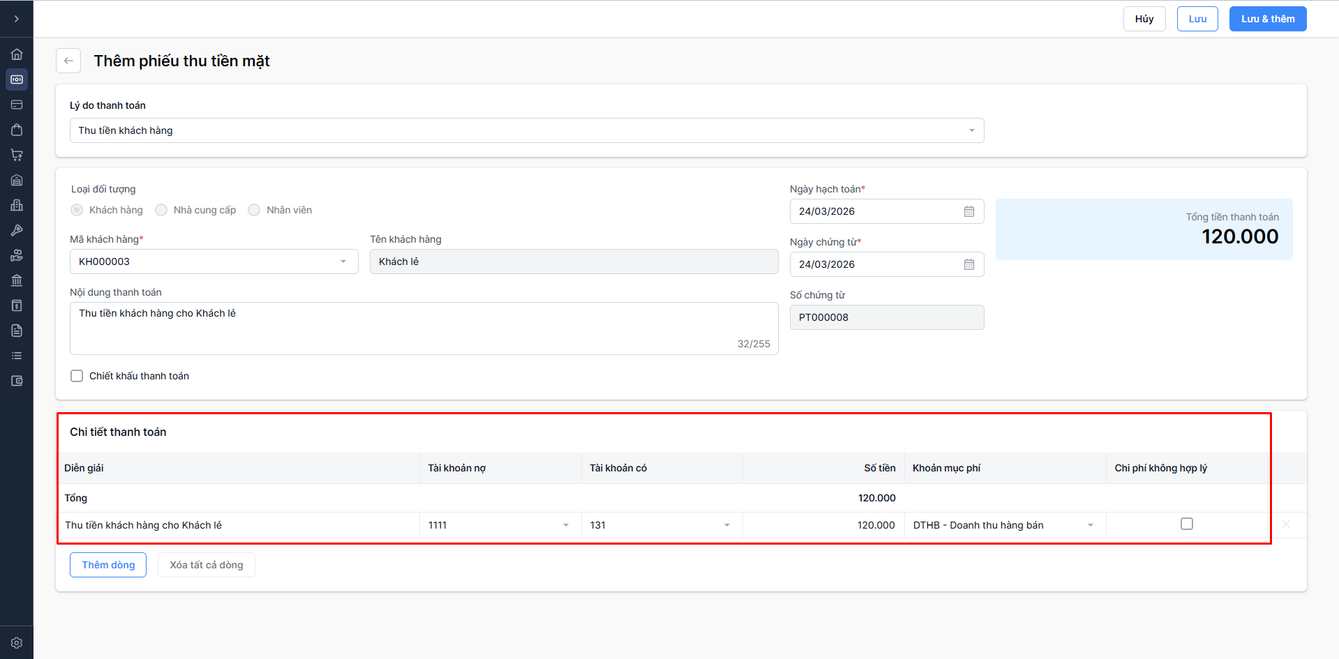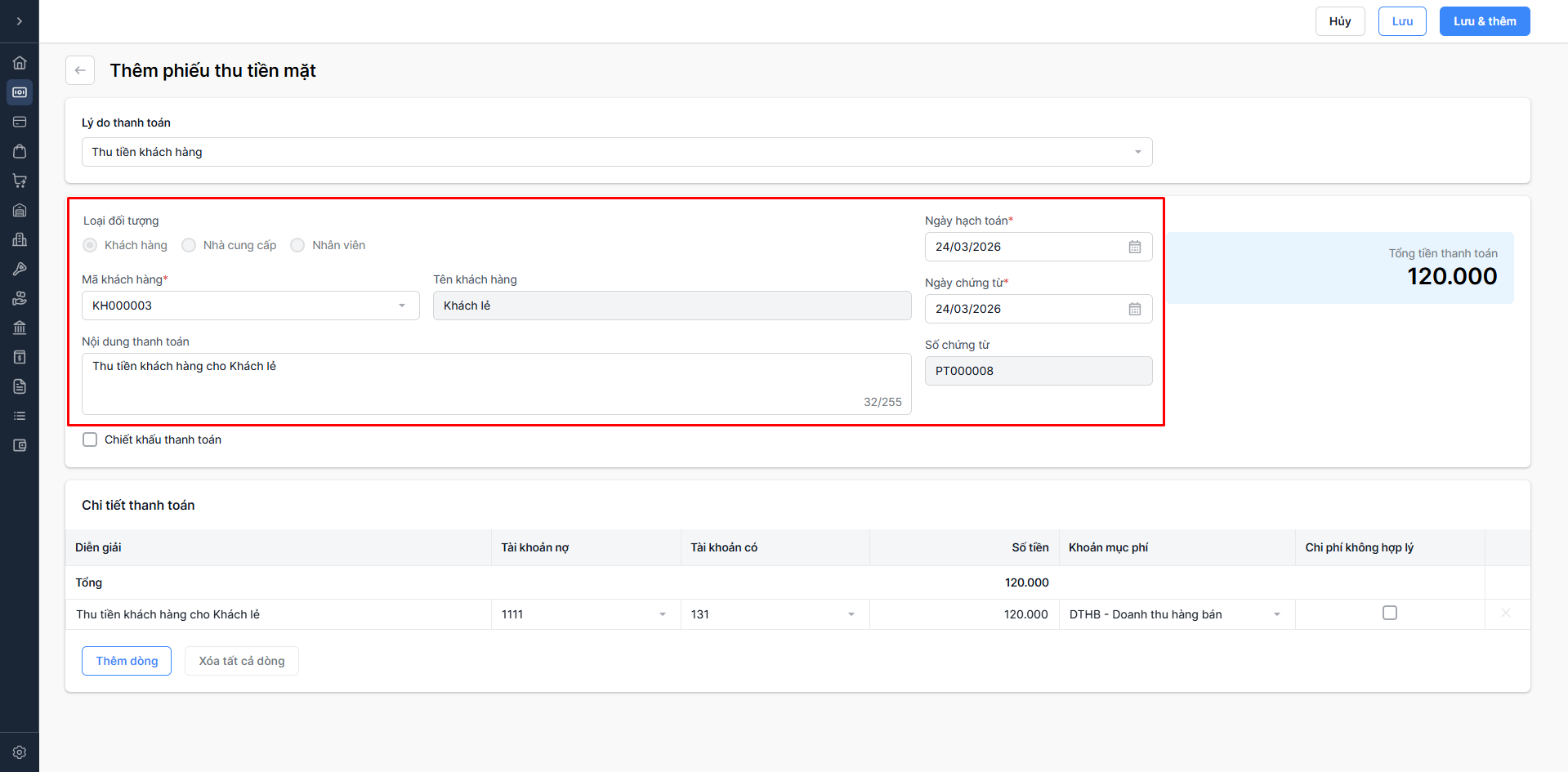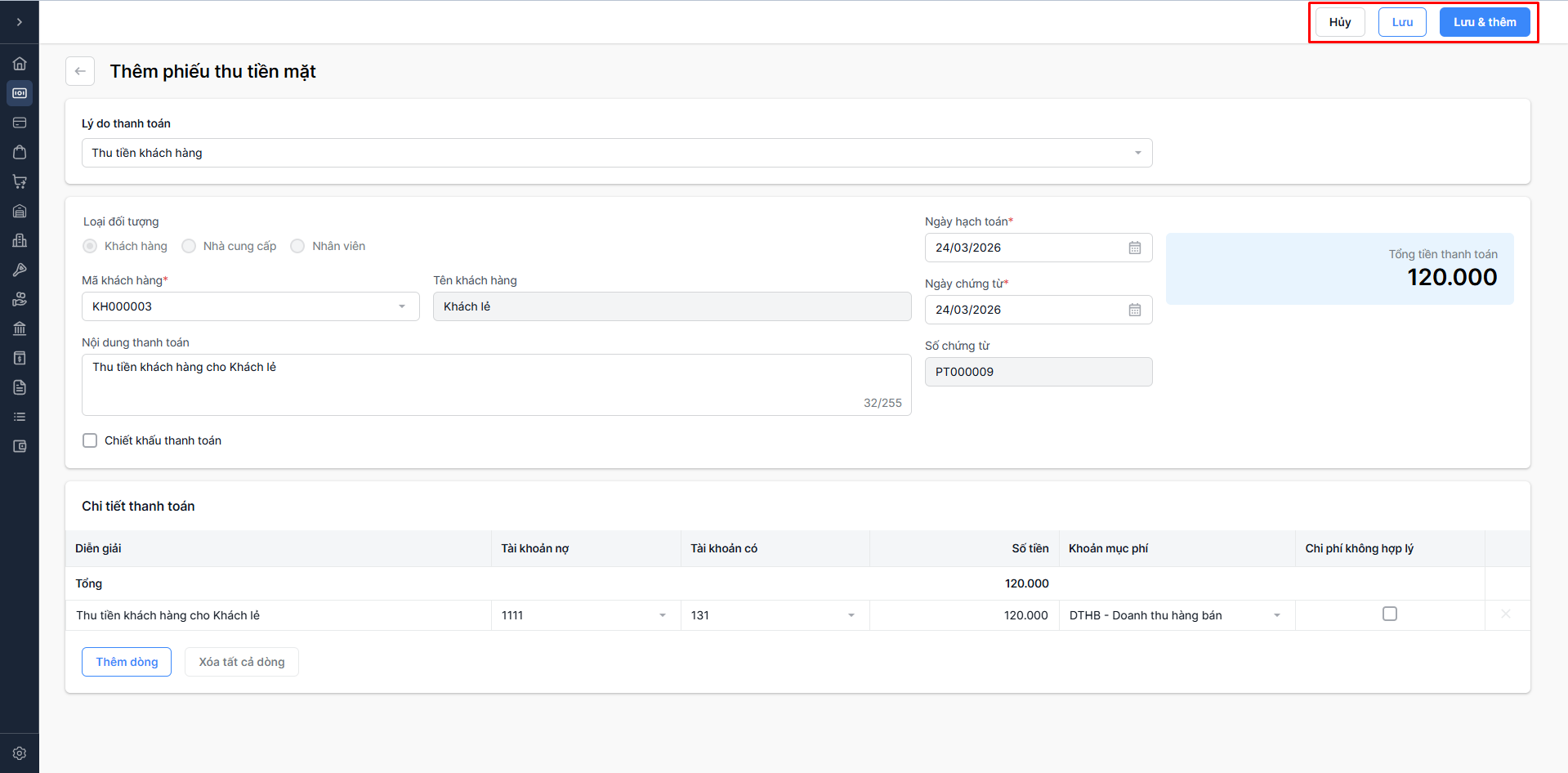 - Chọn Lưu & thêm: Lưu thông tin phiếu thu vừa nhập và tiếp tục thêm phiếu thu mới