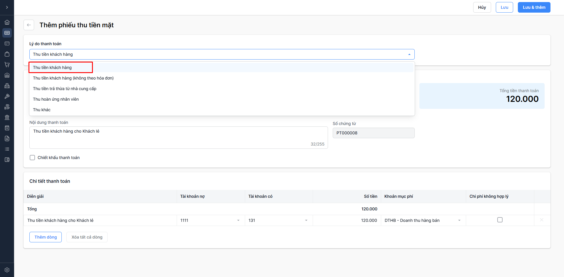 Tại Lý do thanh toán, bạn chọn Thu tiền khách hàng