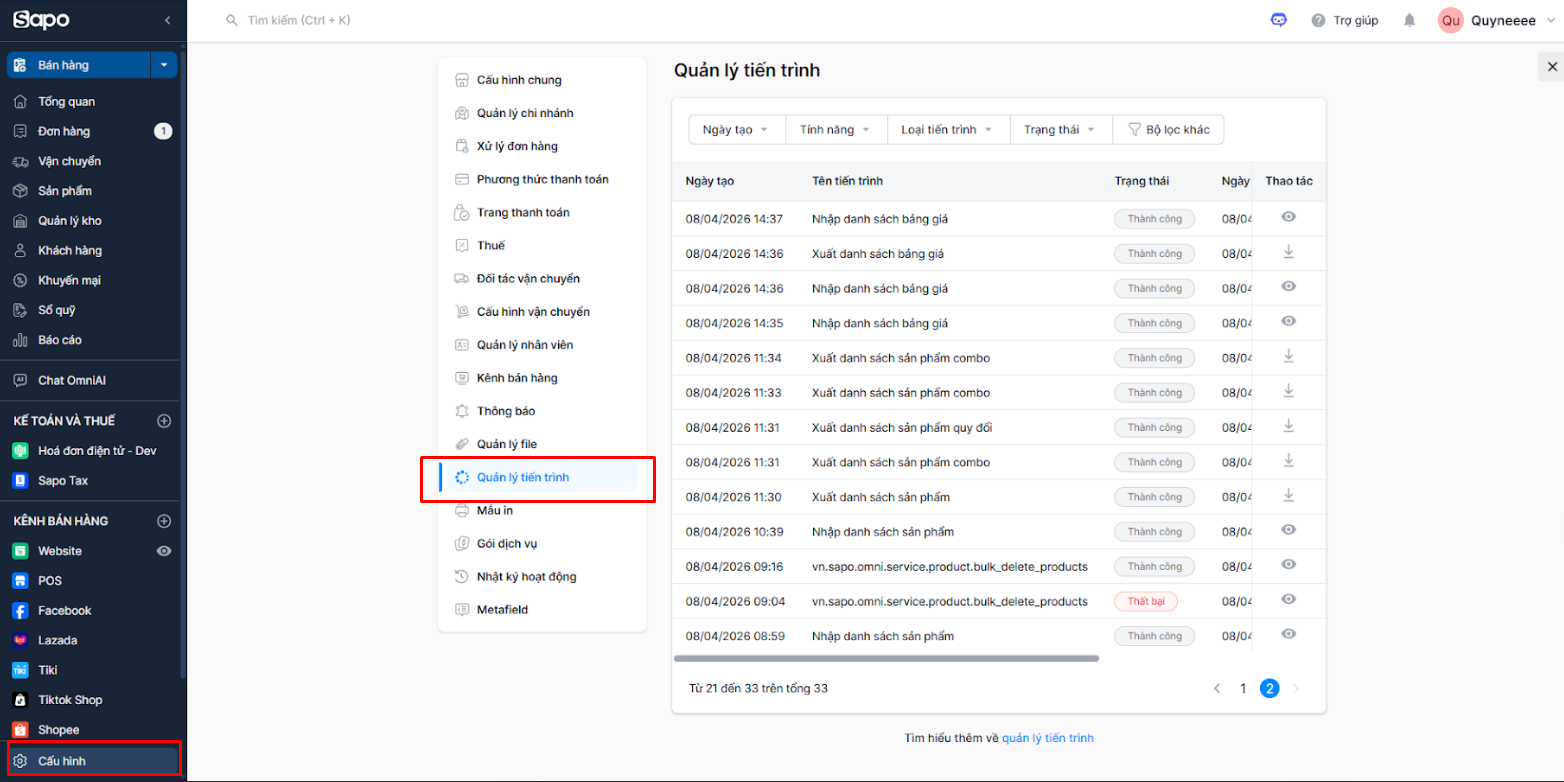 - Trang này chỉ hiển thị các tiến trình tạo ra từ thời điểm ra mắt tính năng: từ 09/04/2026 với các tính năng Xuất/Nhập file sản phẩm, Xuất nhập file bảng giá. Việc quản lý tiến trình thực hiện các tác vụ cập nhật hàng loạt khác sẽ được cập nhật sau trên phần mềm.