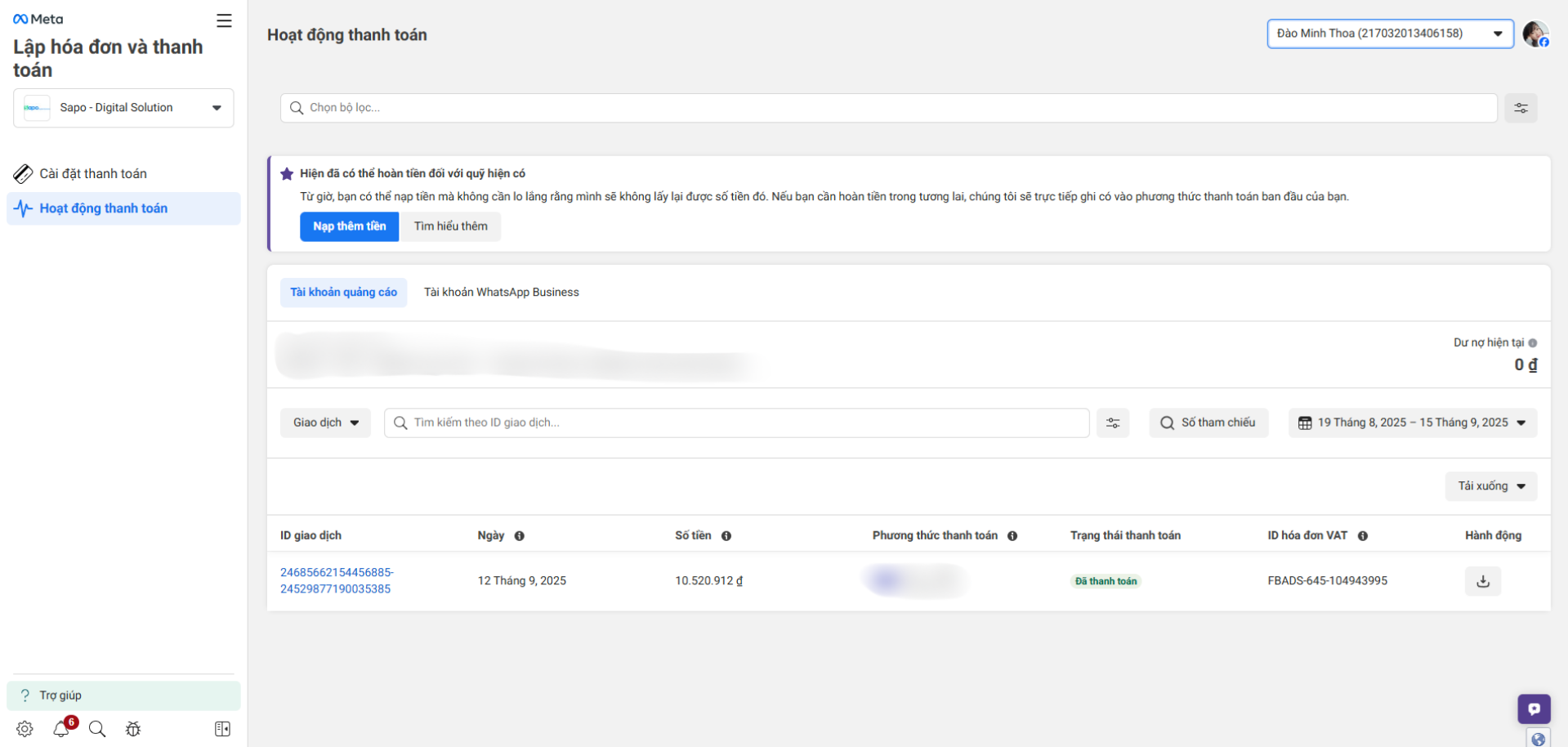 - Để kiểm tra chi phí mà tài khoản quảng cáo của bạn đã chi cho việc gửi tin nhắn Marketing, bạn cần phải truy cập vào Trình quản lý doanh nghiệp trên Meta theo đường link sau: https://business.facebook.com/billing_hub/payment_activity.