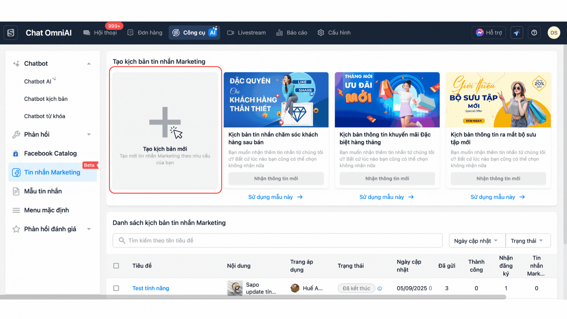 Tại Tin nhắn Marketing, bạn kéo xuống phần Danh sách kịch bản tin nhắn Marketing