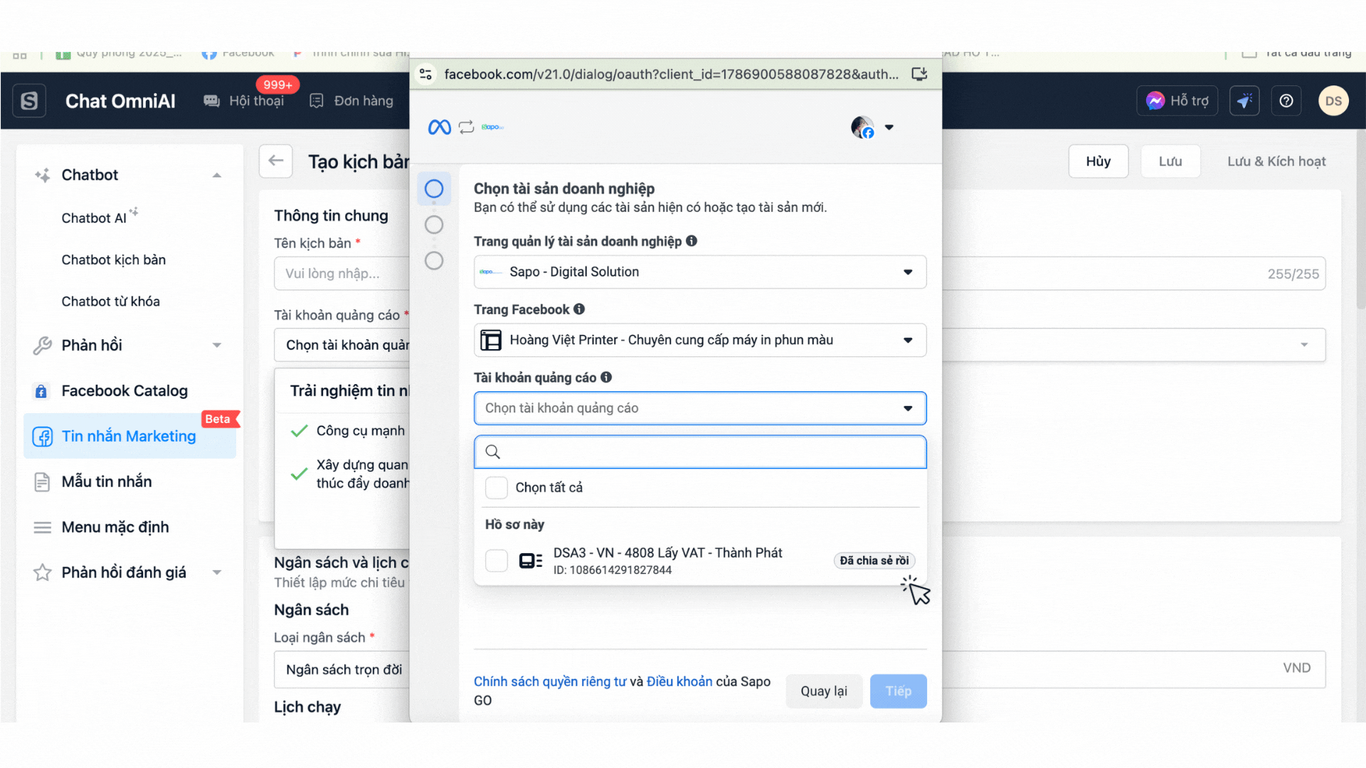 - Lựa chọn Tài khoản quảng cáo và Trang Facebook đã kích hoạt trên Chat OmniAI.