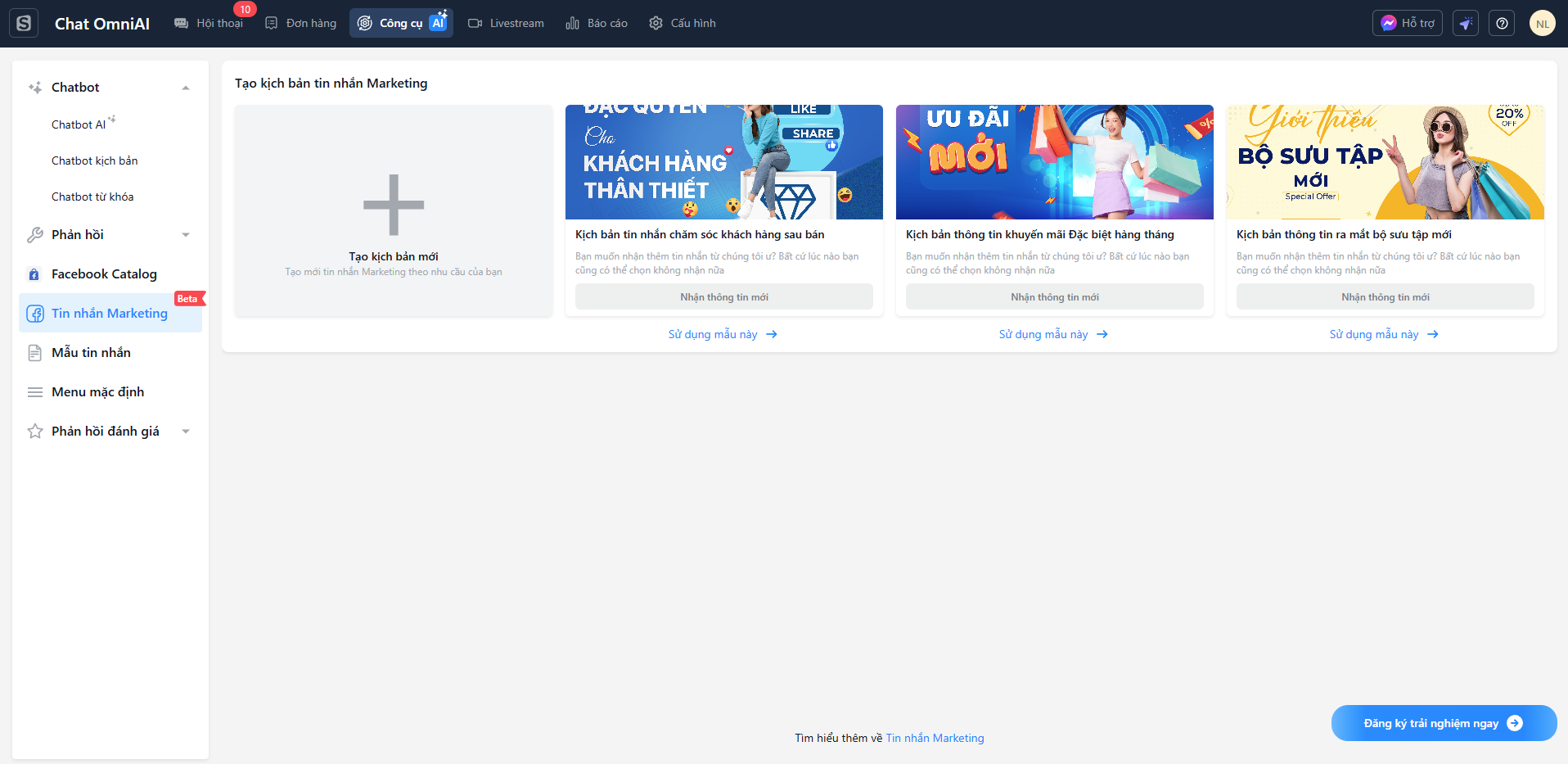 - Tại màn quản lý trang của Chat OmniAI, trên thanh menu đầu trang bạn bấm chọn Công cụ AI → chọn Tin nhắn Marketing.