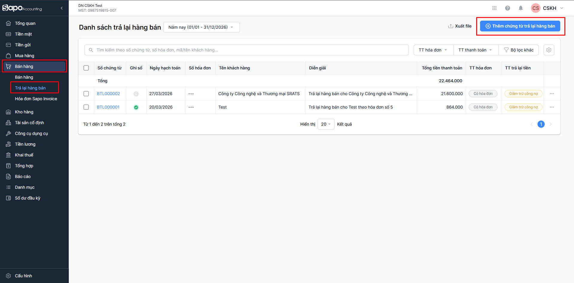 Trên thanh menu bên trái trang quản trị, bạn chọn Bán hàng > Trả lại hàng bán. Hệ thống sẽ điều hướng đến màn hình Danh sách trả lại hàng bán.