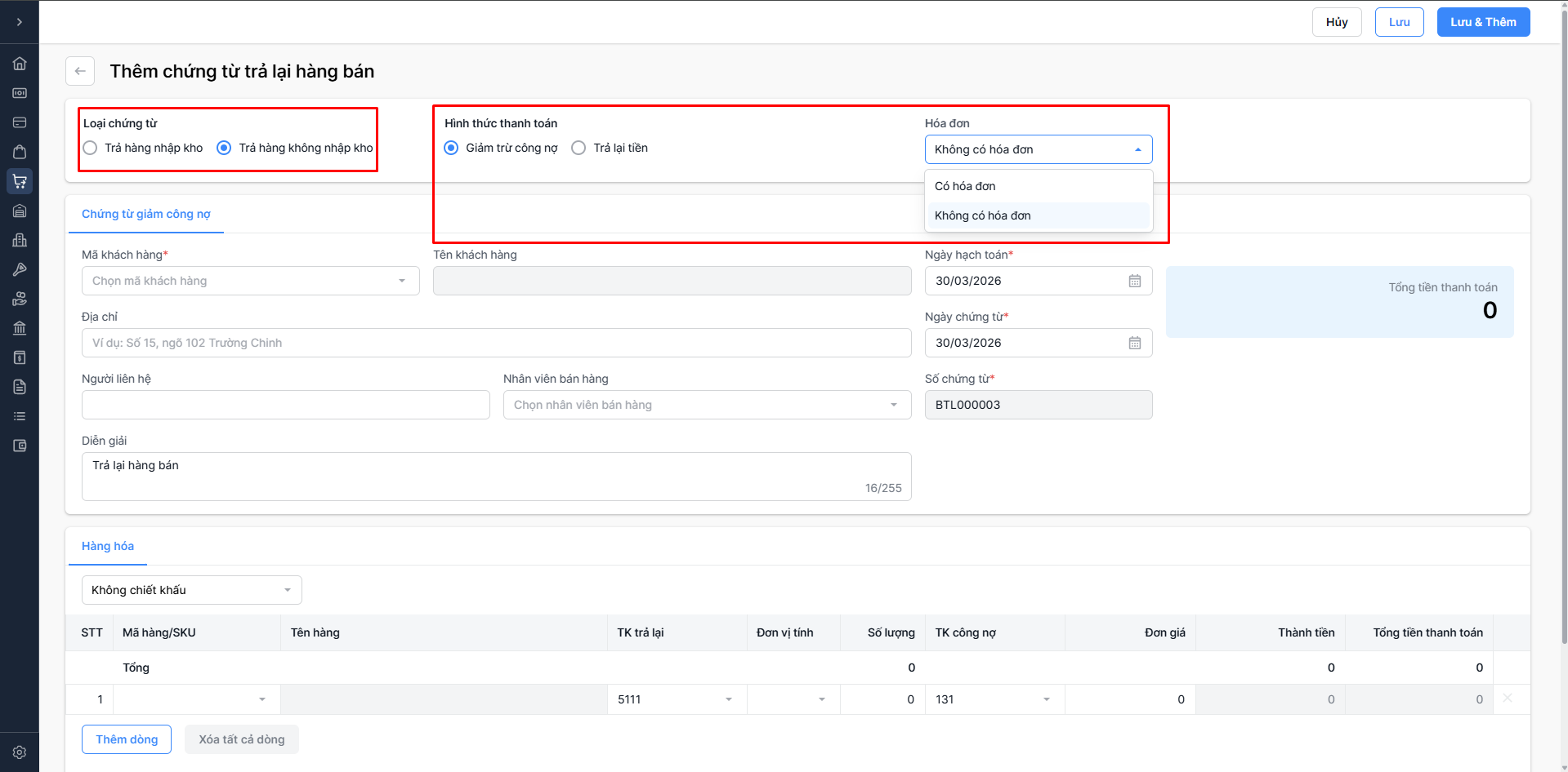 Không có hóa đơn: Trả lại hàng bán không có hóa đơn.