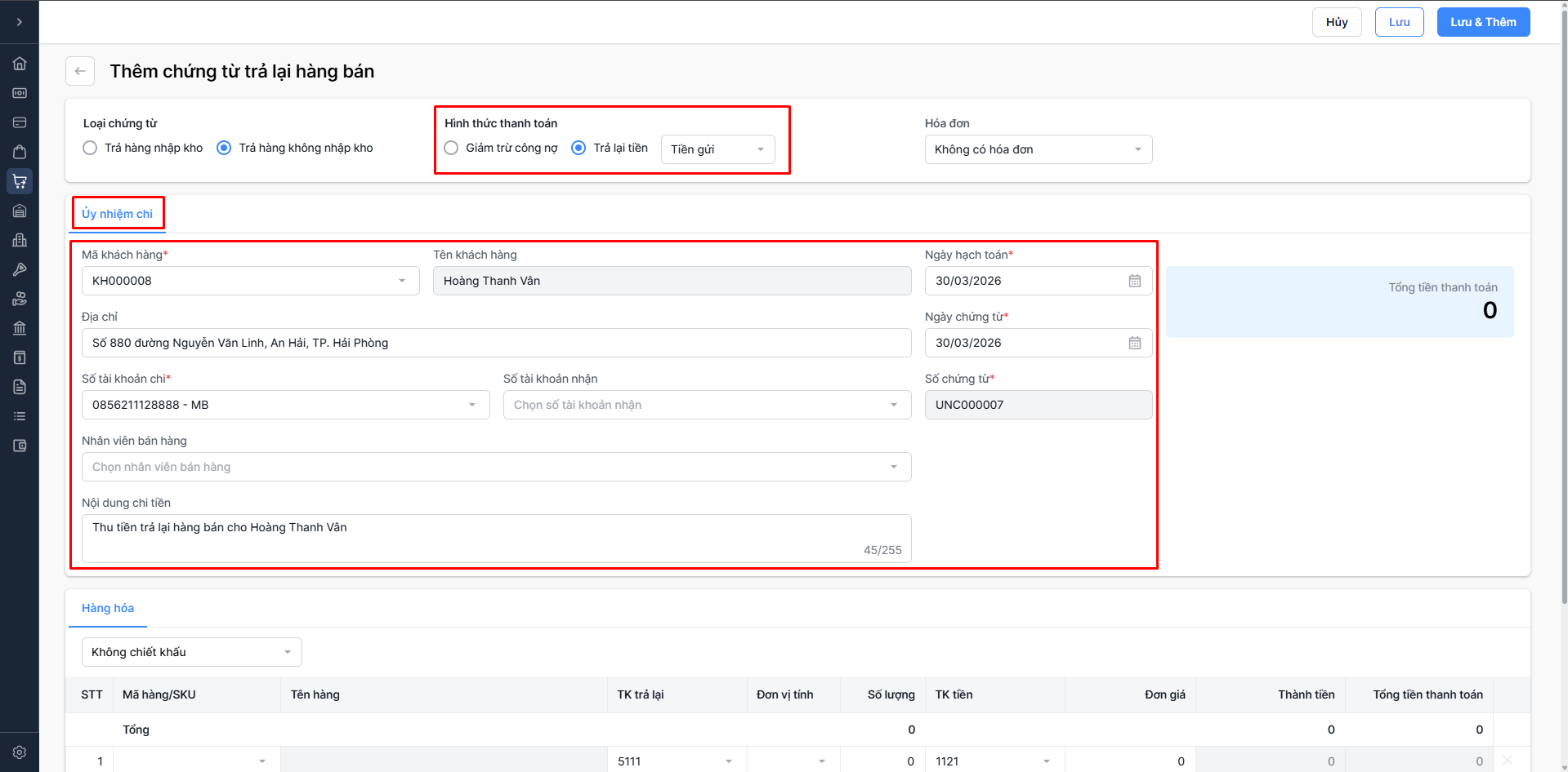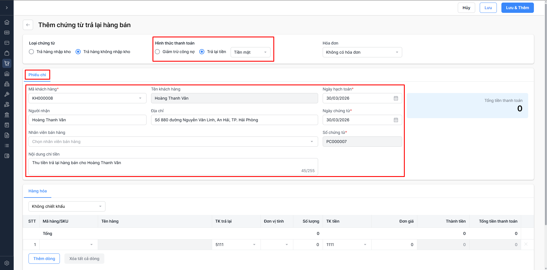 Hoàn tiền ngay: Trả tiền lại cho khách hàng (Chọn Tiền mặt hoặc Tiền gửi).