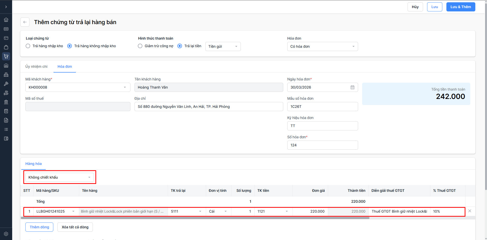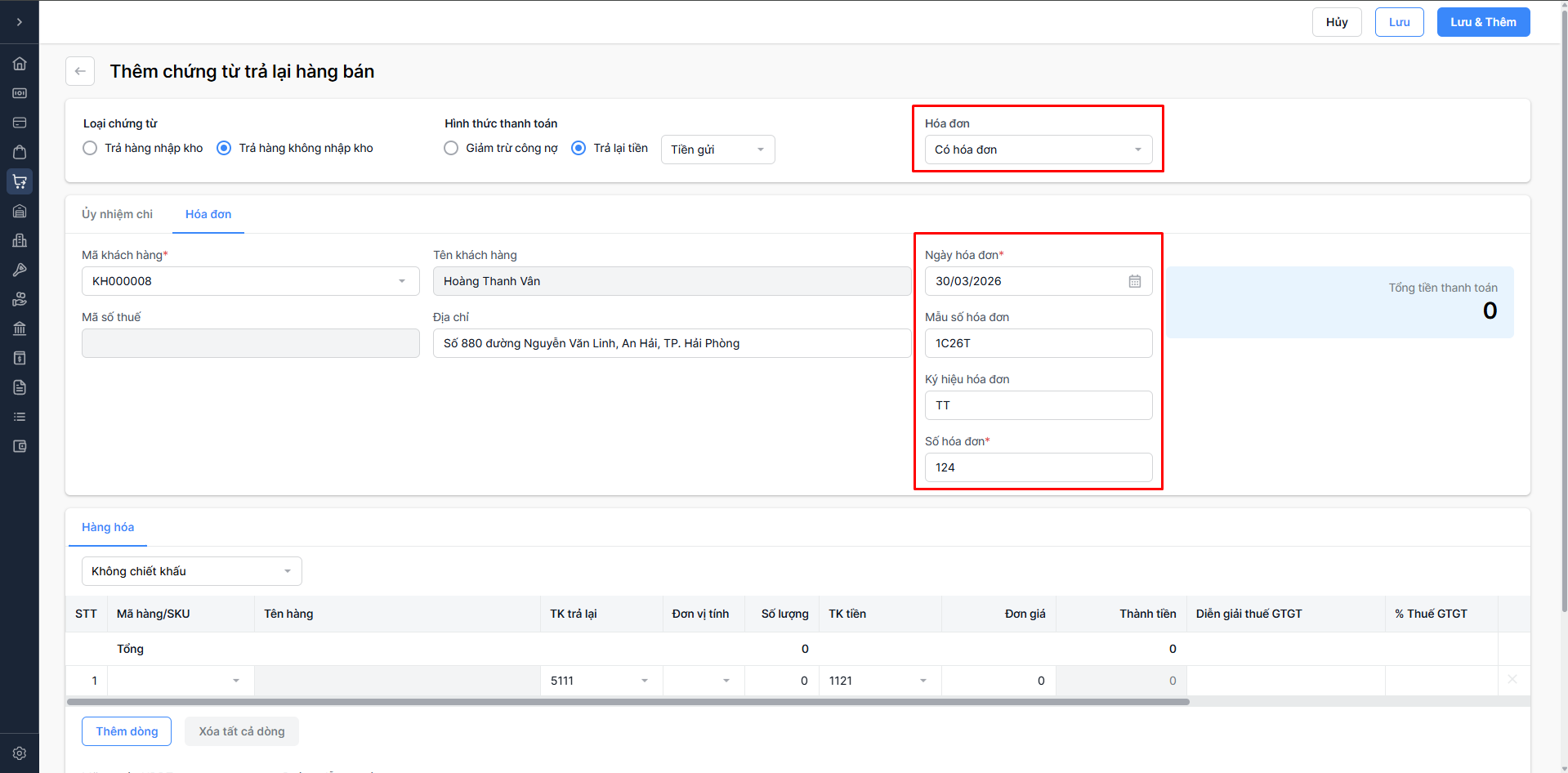 Có hóa đơn: Trả lại hàng bán có hóa đơn.