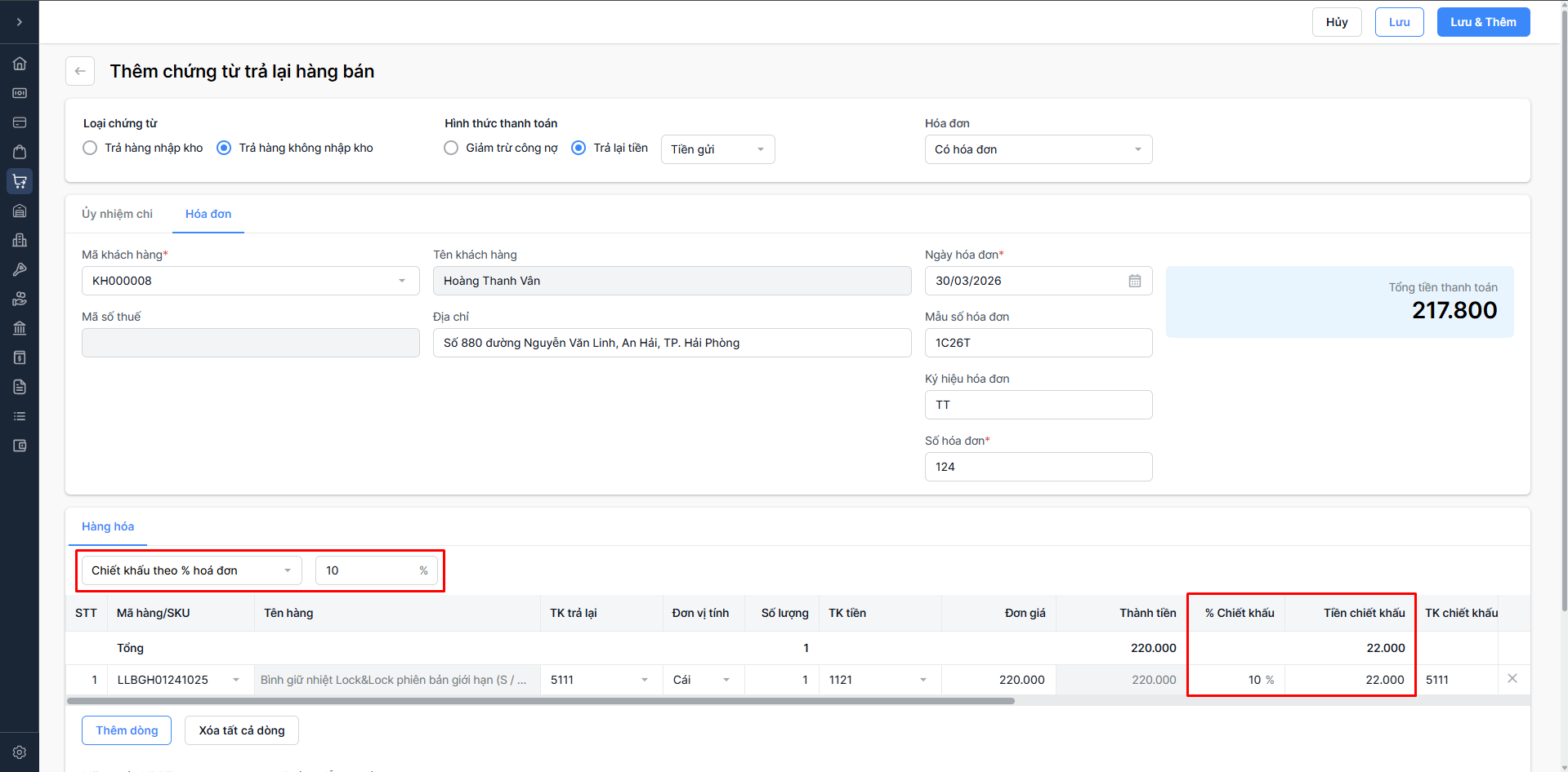 Trường hợp 2: Chiết khấu theo % hóa đơn: