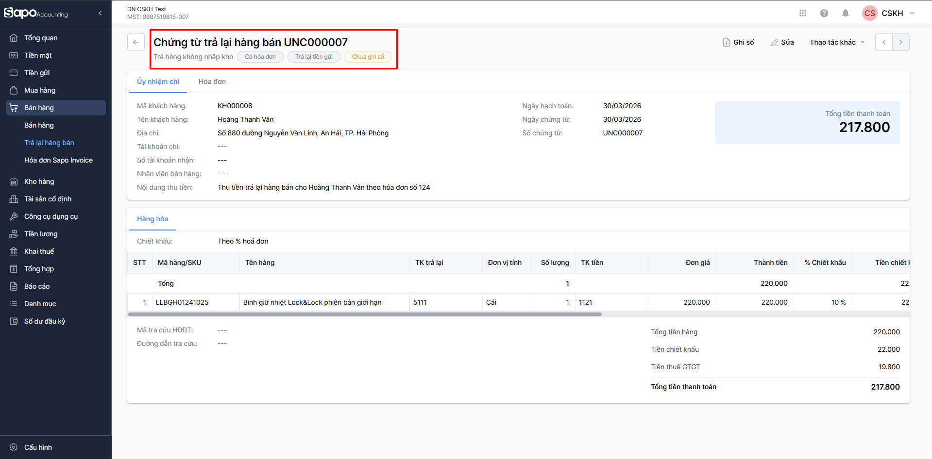 Trả lại hàng bán không nhập kho trên Sapo Accounting - Doanh nghiệp (DN)