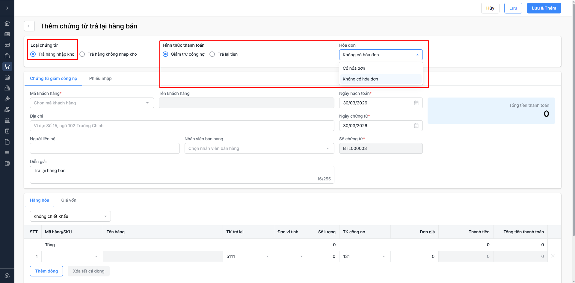 Không có hóa đơn : Trả lại hàng bán không có hóa đơn.