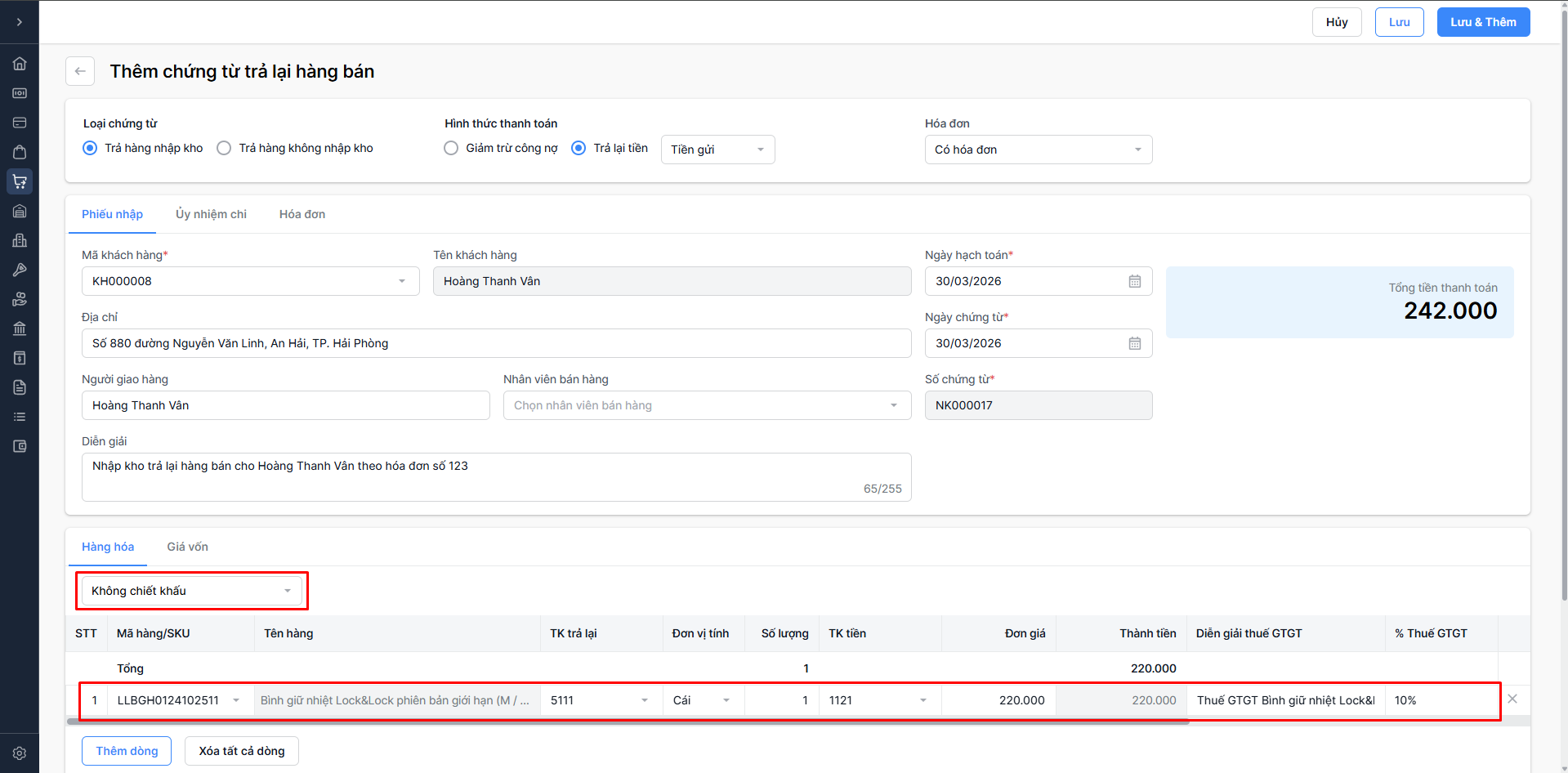 Không cần nhập thông tin chiết khấu.