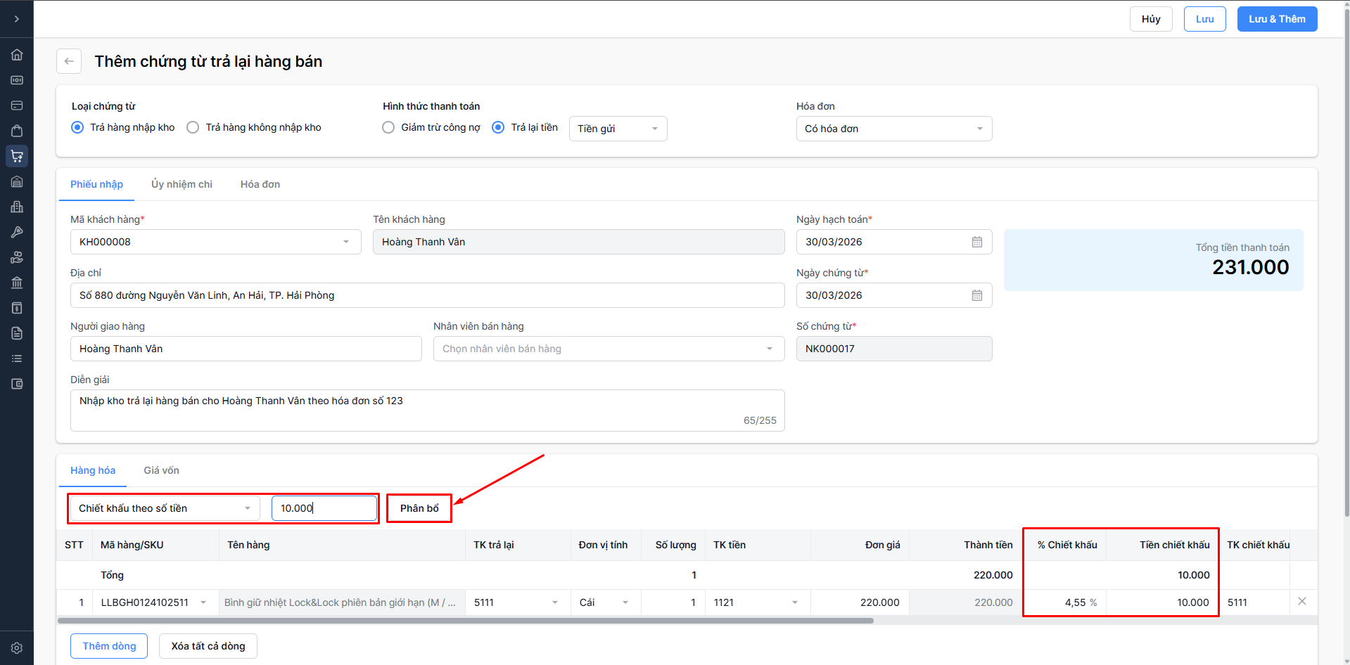 Nhập giá trị chiết khấu > Nhấn chọn Phân bổ . Hệ thống tự động tính Tiền chiết khấu theo tỷ trọng thành tiền từng dòng hàng hóa.
