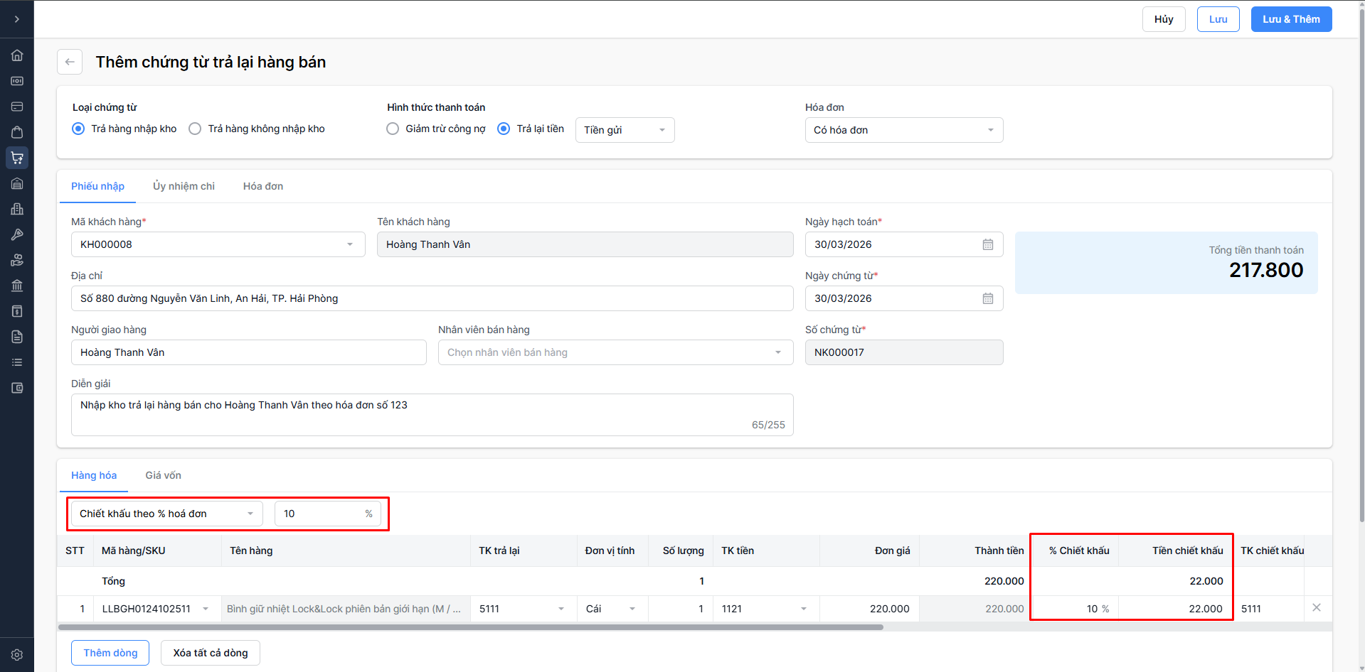 Trường hợp 2: Chiết khấu theo % hóa đơn