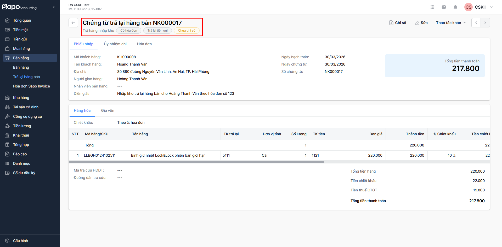 Nhấn Ghi sổ để dữ liệu được ghi nhận vào các báo cáo liên quan.