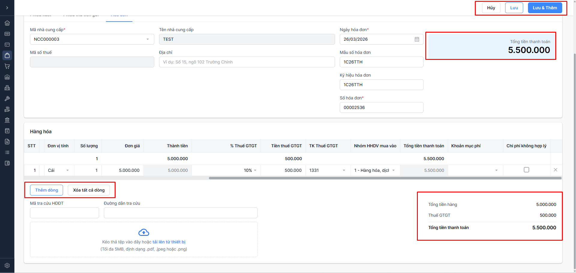 Mã nhà cung cấp (bắt buộc): Chọn mã NCC, hệ thống tự động điền tên nhà cung cấp (không thể tùy chỉnh), địa chỉ (có thể tùy chỉnh).