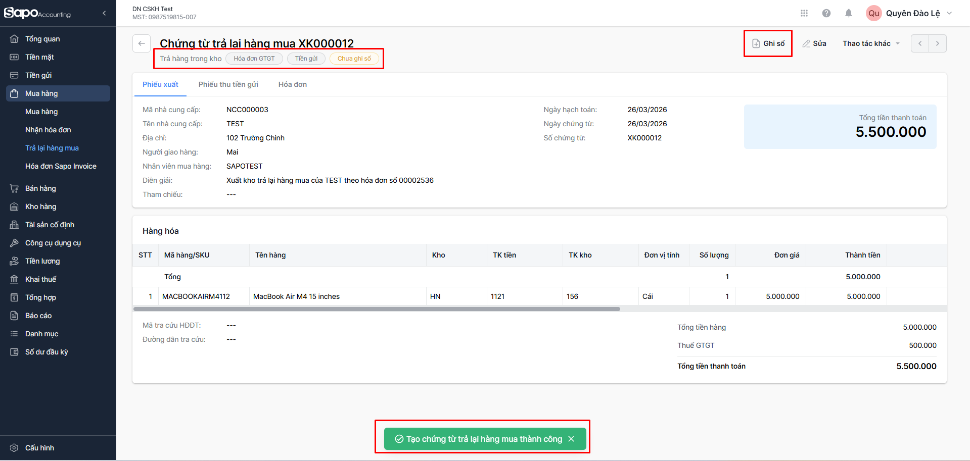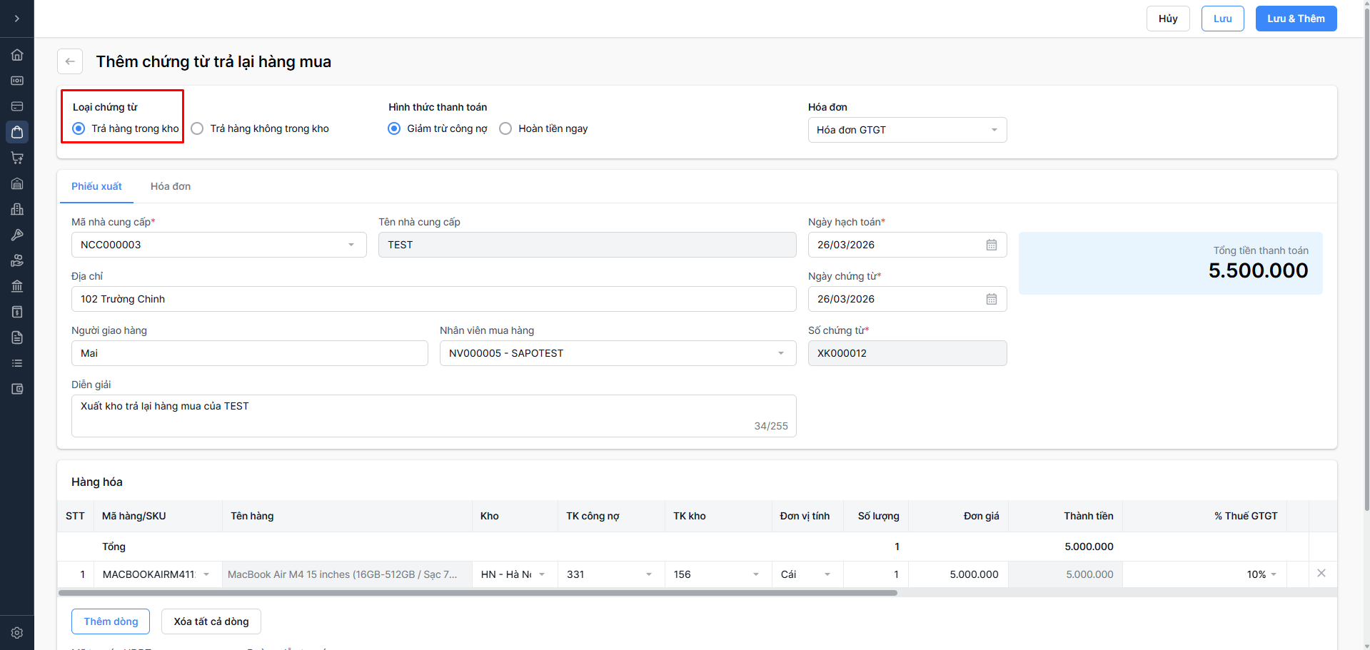 Trả lại hàng mua trong kho trên Sapo Accounting - Doanh nghiệp (DN)