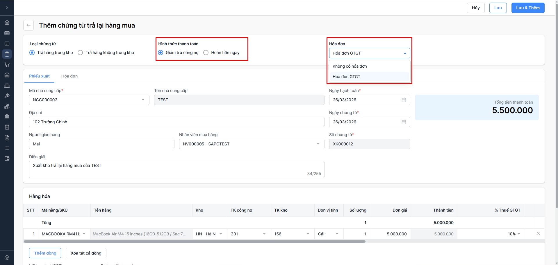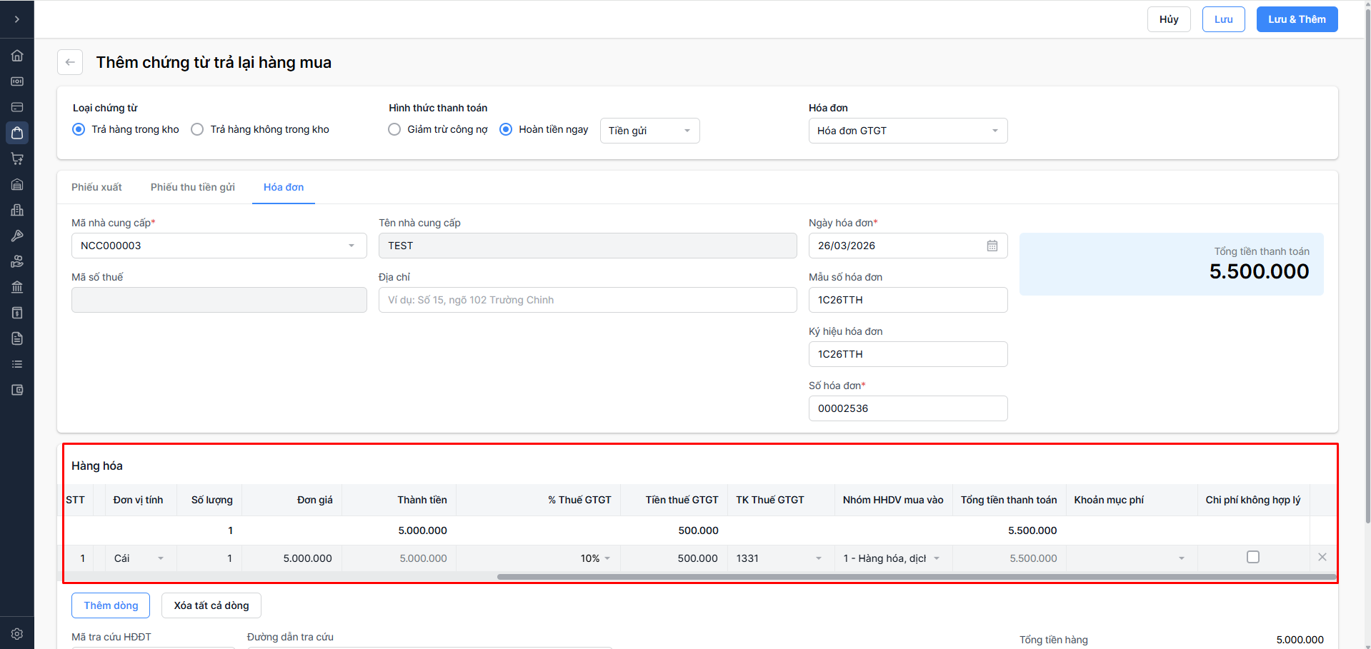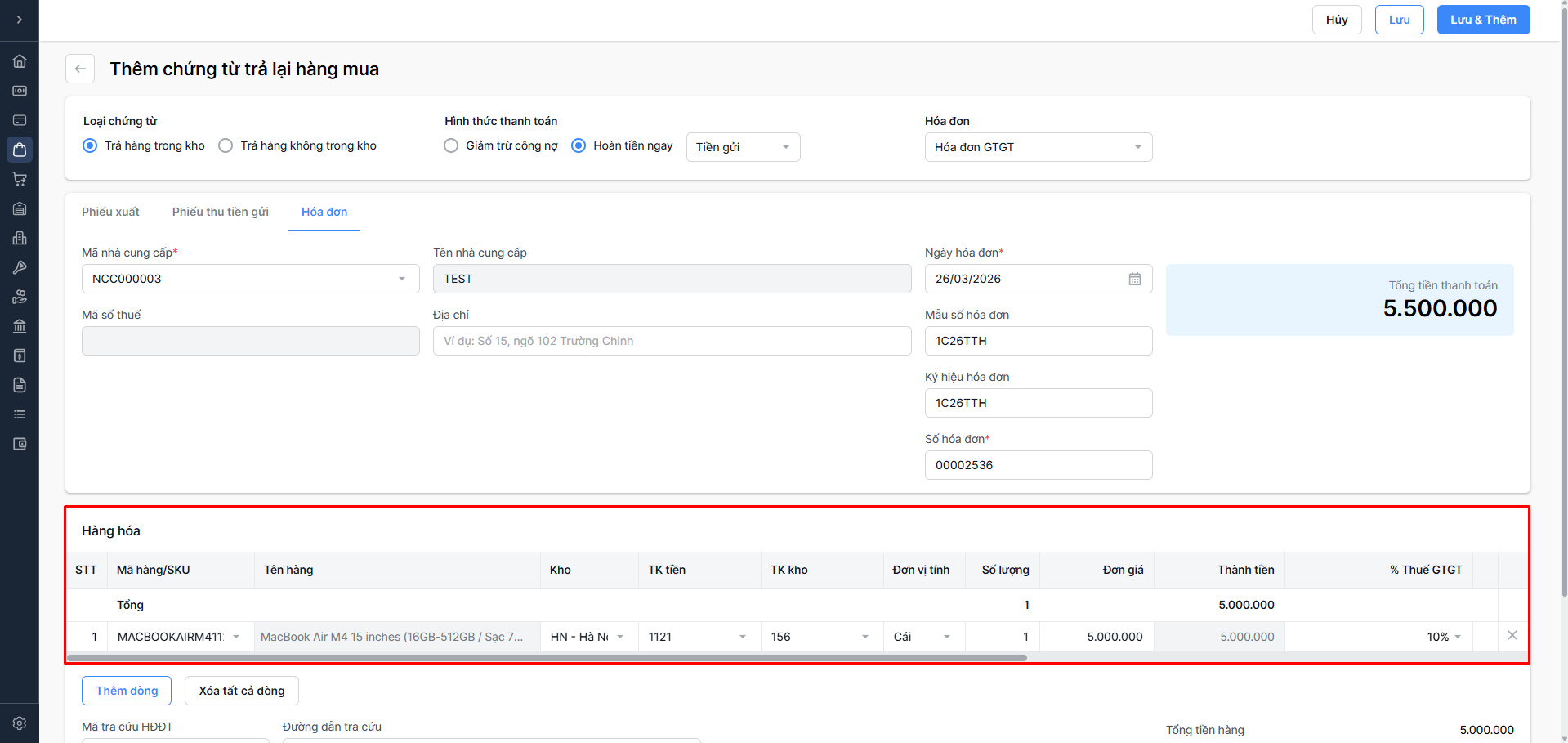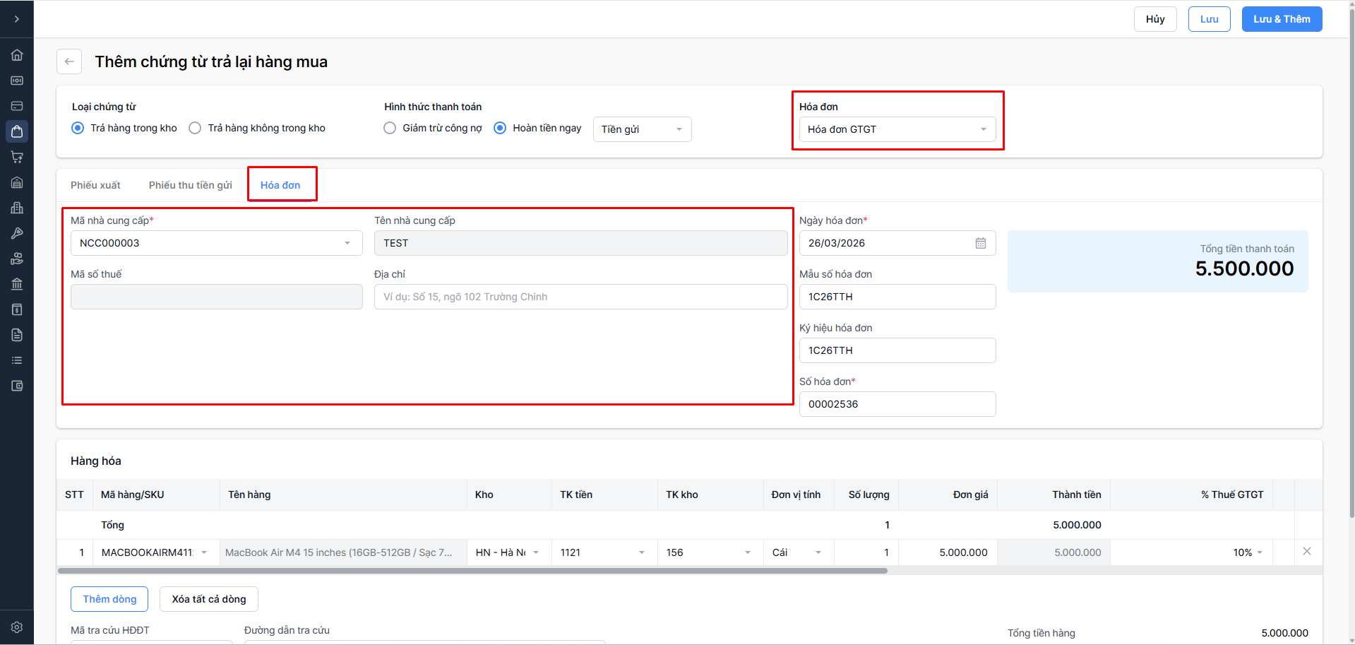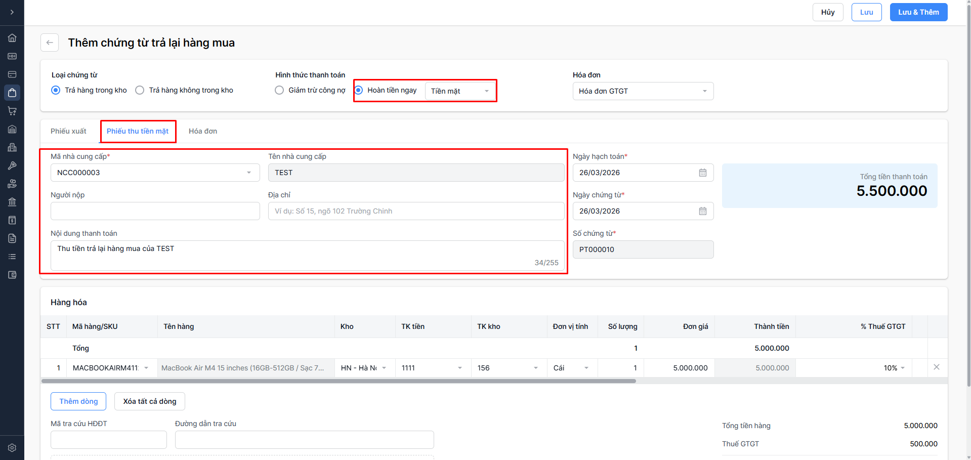 Hoàn tiền ngay: Nhà cung cấp trả tiền lại (Chọn Tiền mặt hoặc Tiền gửi).