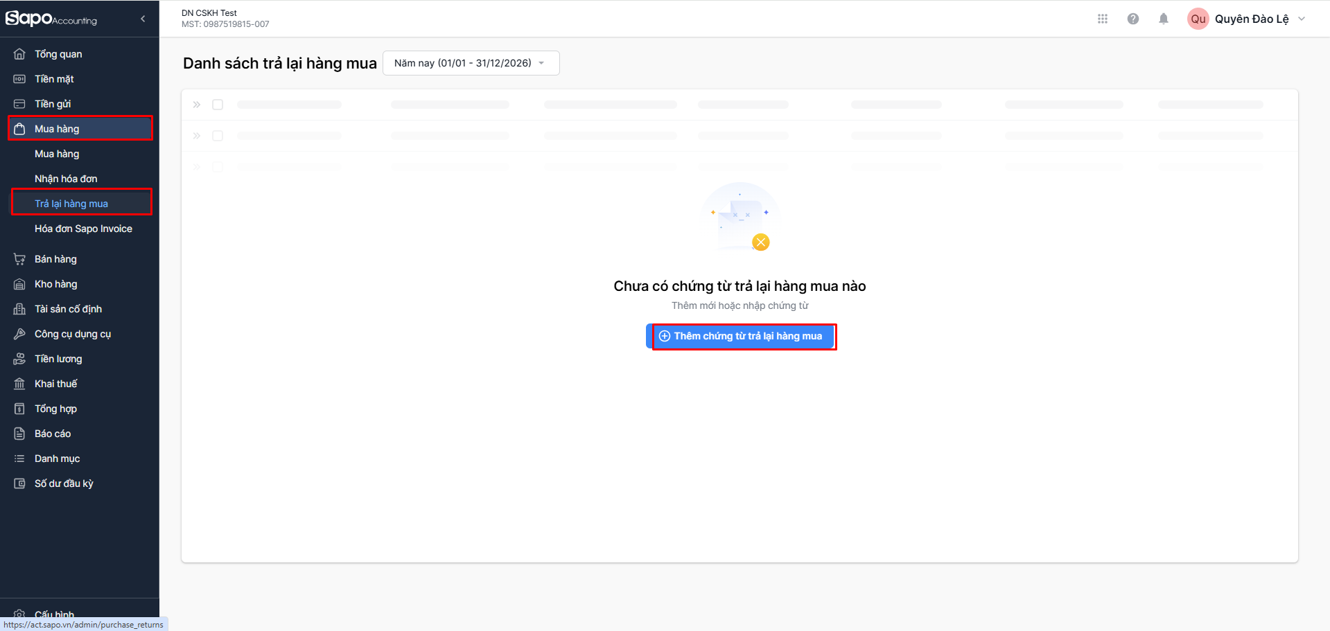 Nhấn vào nút Thêm chứng từ trả lại hàng mua.