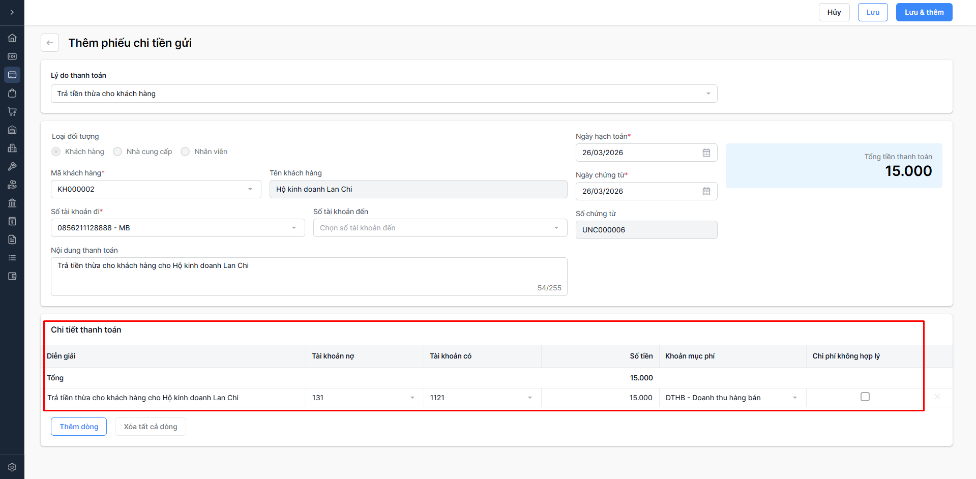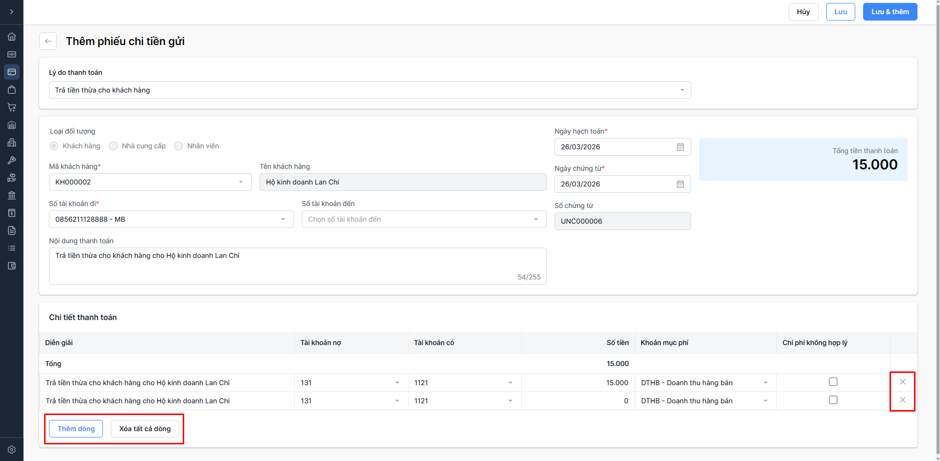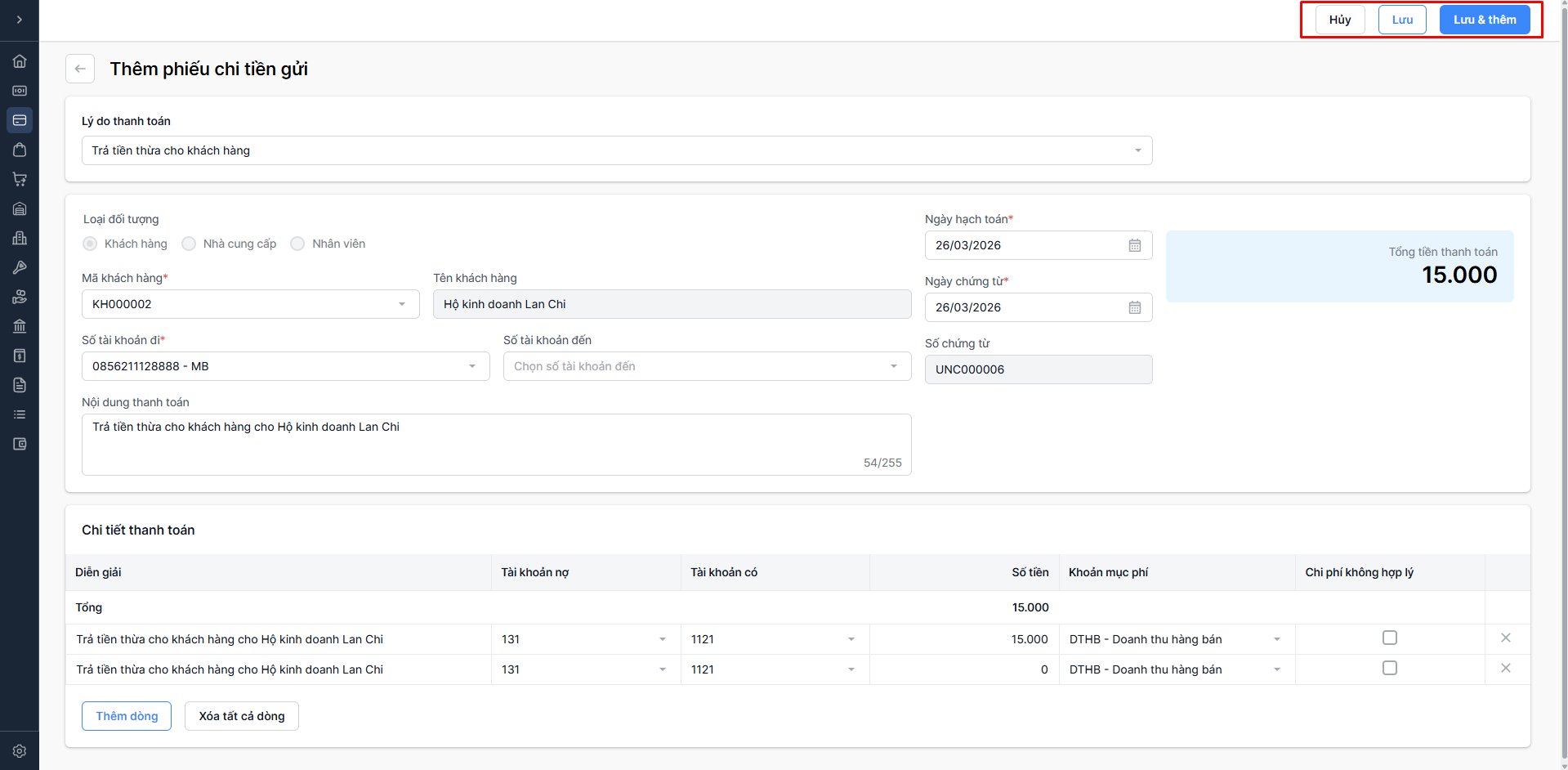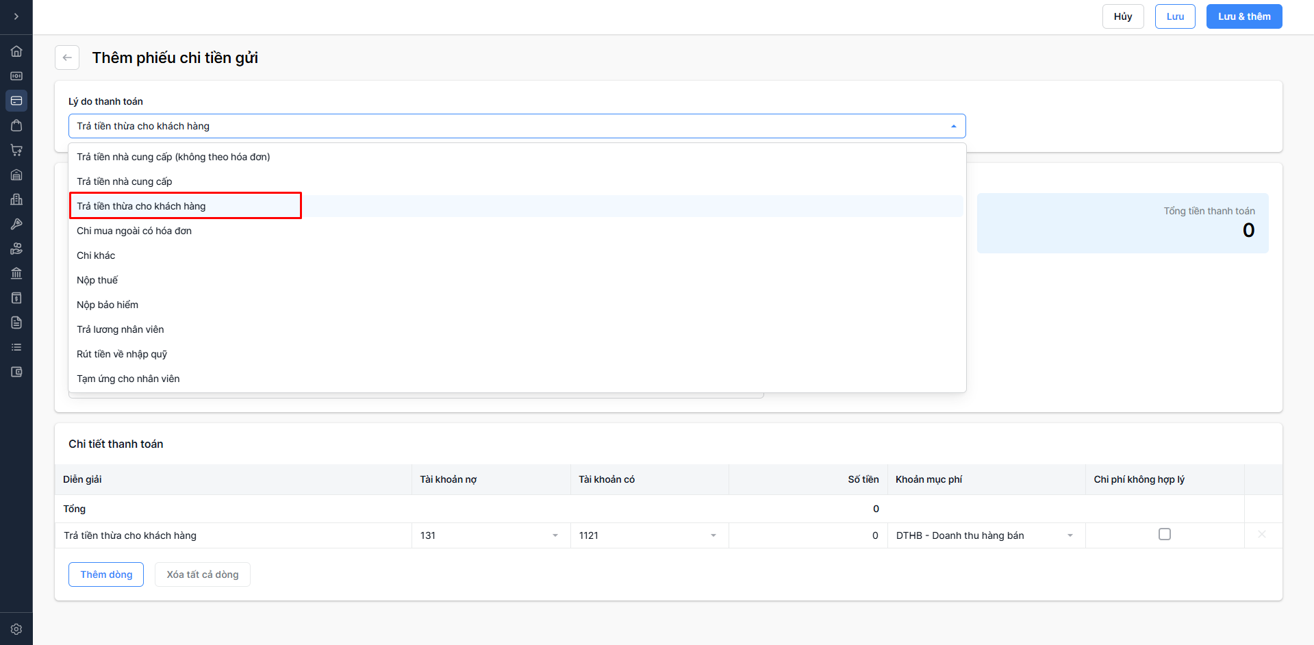 - Chọn Lưu & thêm: Lưu thông tin phiếu chi vừa nhập và tiếp tục thêm phiếu chi mới.