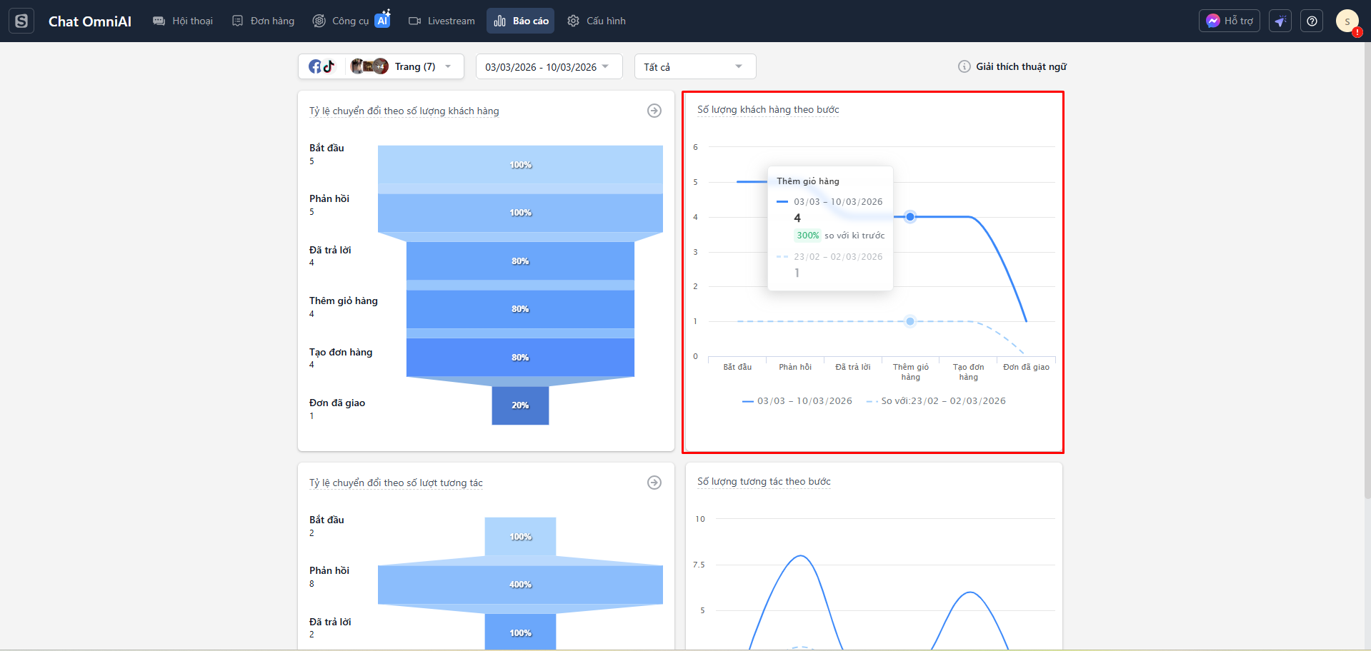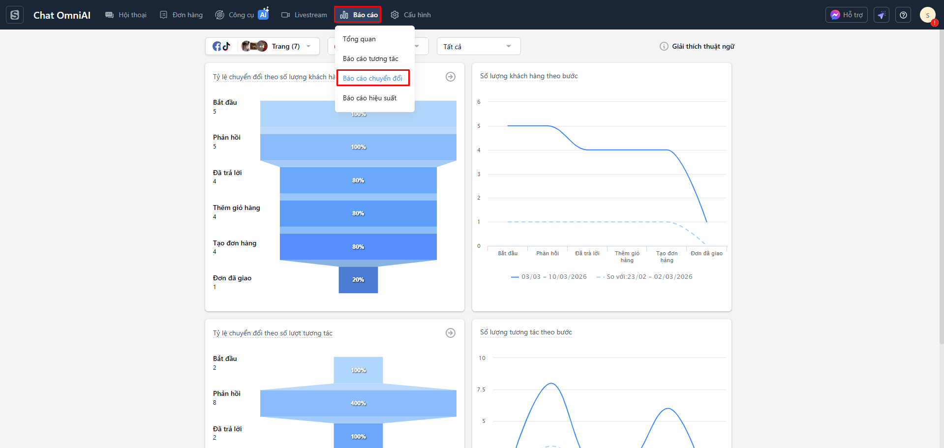 - Báo cáo tổng quan: Báo cáo hiển thị tỷ lệ chuyển đổi và số lượng tương tác chuyển đổi ở từng bước trên hành trình khách hàng. Giúp bạn đánh giá hiệu suất của từng bước trong việc chuyển đổi tương tác thành đơn hàng.