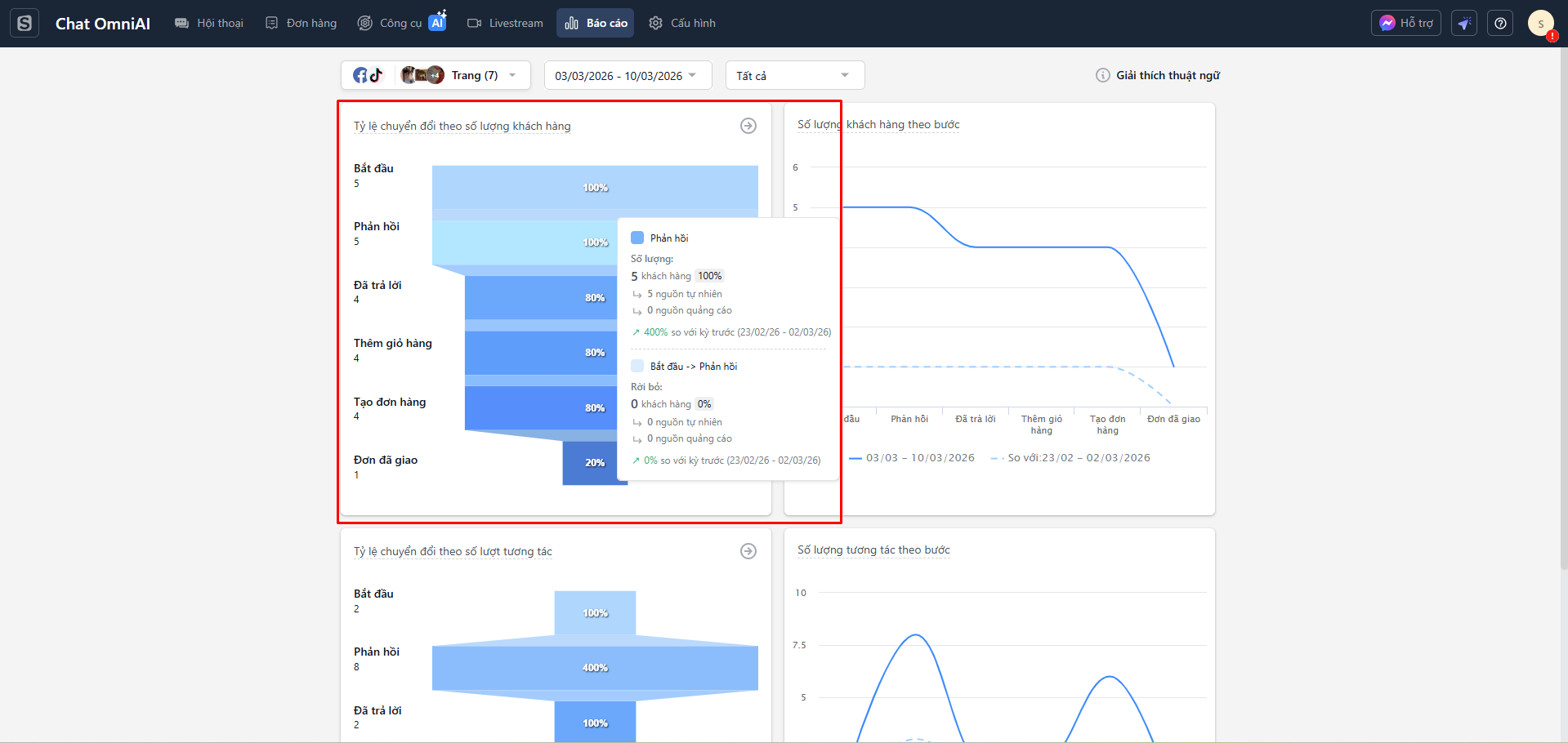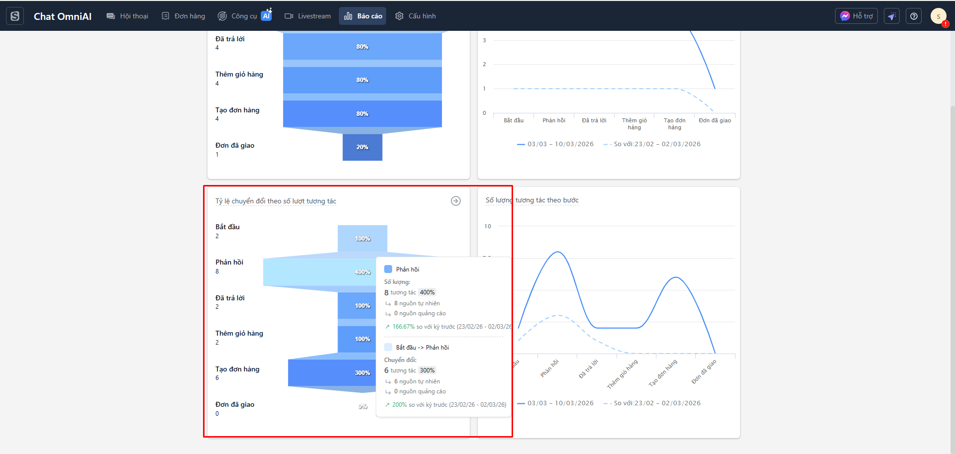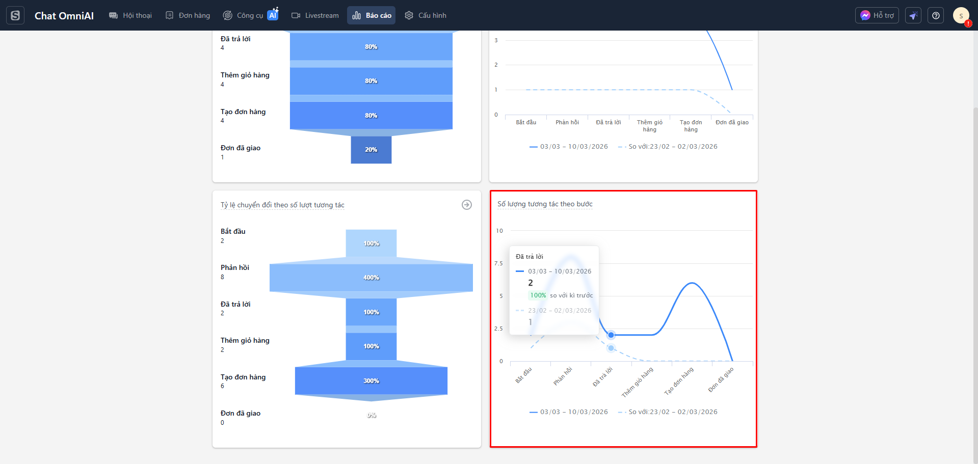 - Mỗi điểm trên biểu đồ tương ứng với số lượng tương tác đạt tới bước đó. Khi di chuột vào từng điểm, hệ thống hiển thị thông tin chi tiết của bước, bao gồm số lượng tương tác trong kỳ hiện tại, số liệu của kỳ trước và tỷ lệ thay đổi.