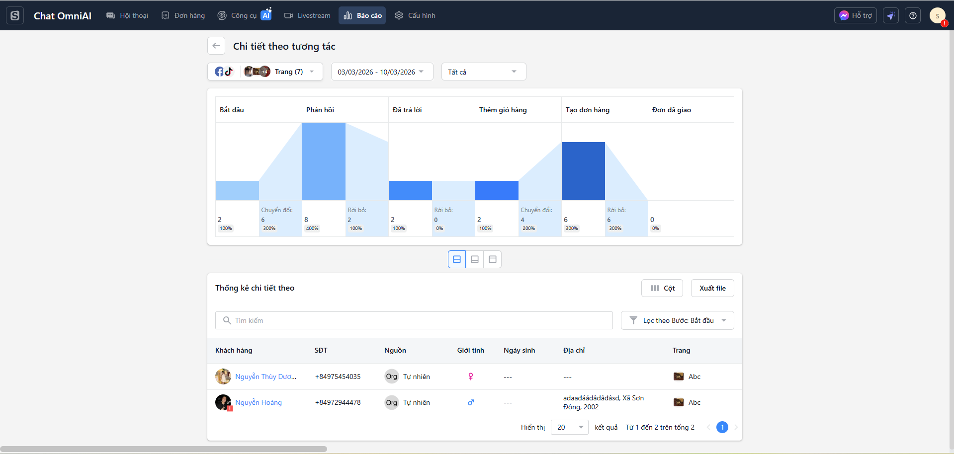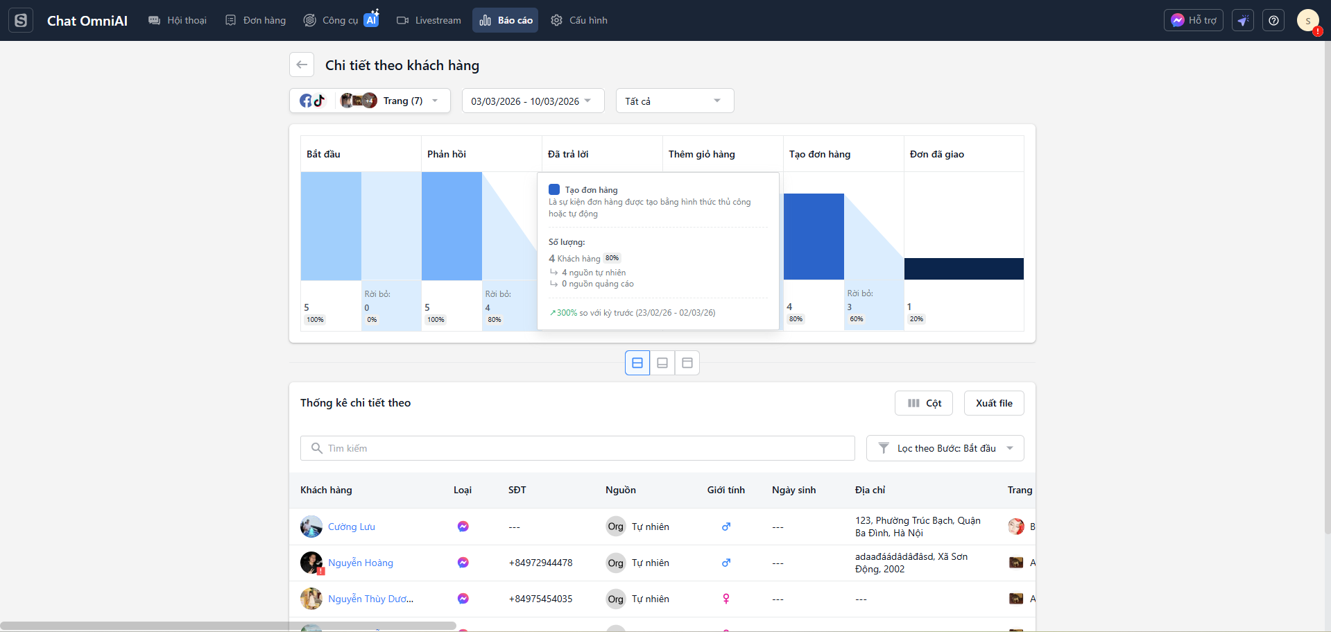 - Bảng dữ liệu thông tin khách hàng: Tên khách hàng, Số điện thoại, Nguồn, Giới tính, Ngày sinh, Địa chỉ, Trang, Bước, Thời gian bắt đầu, Bài viết, Người phản hồi, Thời gian phản hồi, Đã xem, Thời gian trả lời, Số sản phẩm, Số đơn hàng, Tổng doanh thu, Số đơn đã giao và Lợi nhuận gộp.
