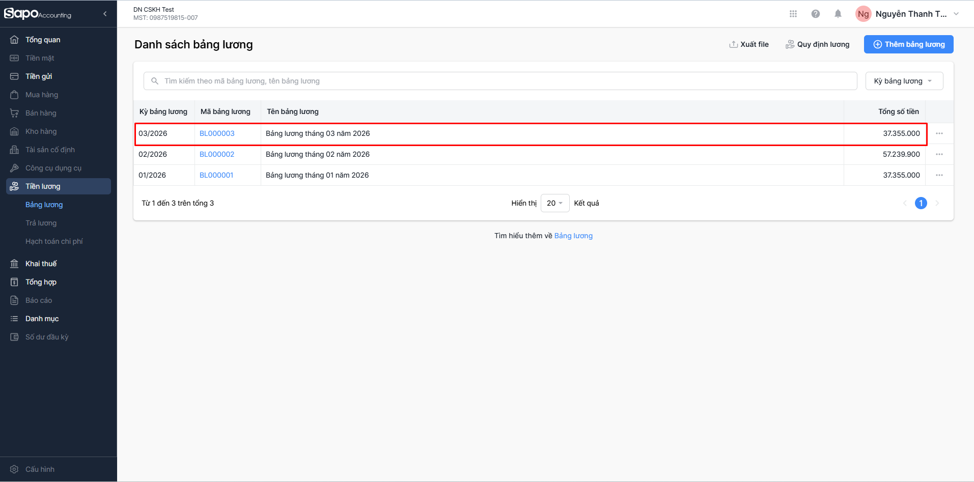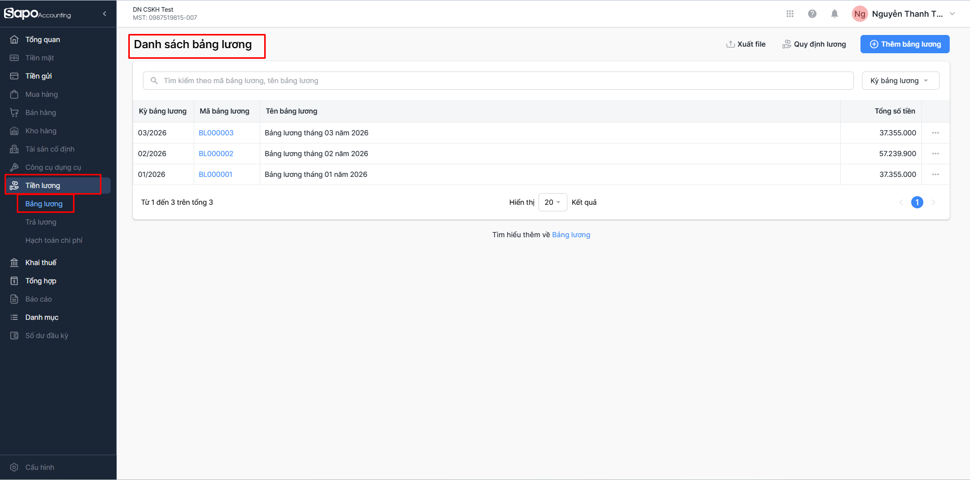 - Trên thanh menu bên trái trang quản trị, bạn chọn Tiền lương. Hệ thống tự động điều hướng bạn đến màn hình Danh sách bảng lương.
