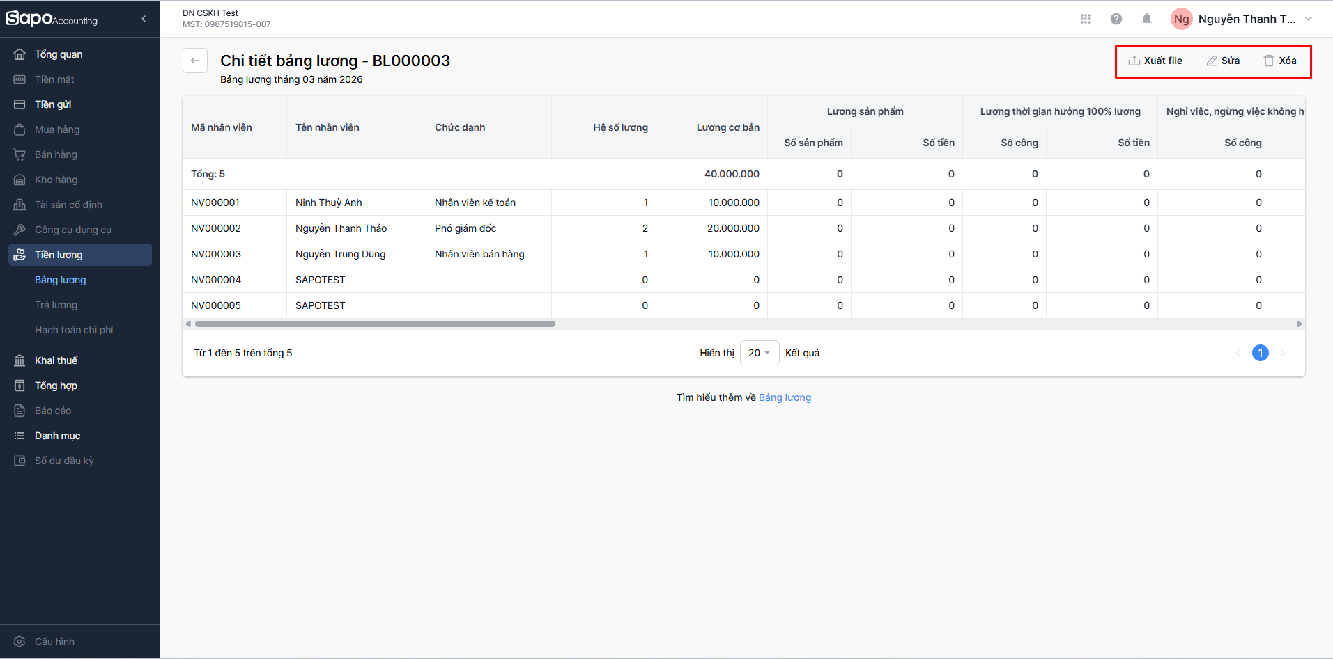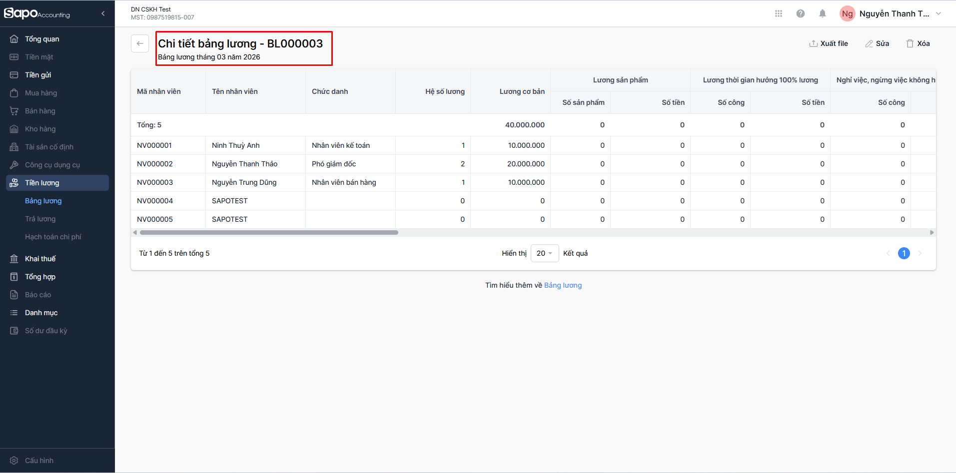 - Xuất file: Nhấp vào Xuất file để tải xuống file bảng lương để lưu trữ chứng từ.