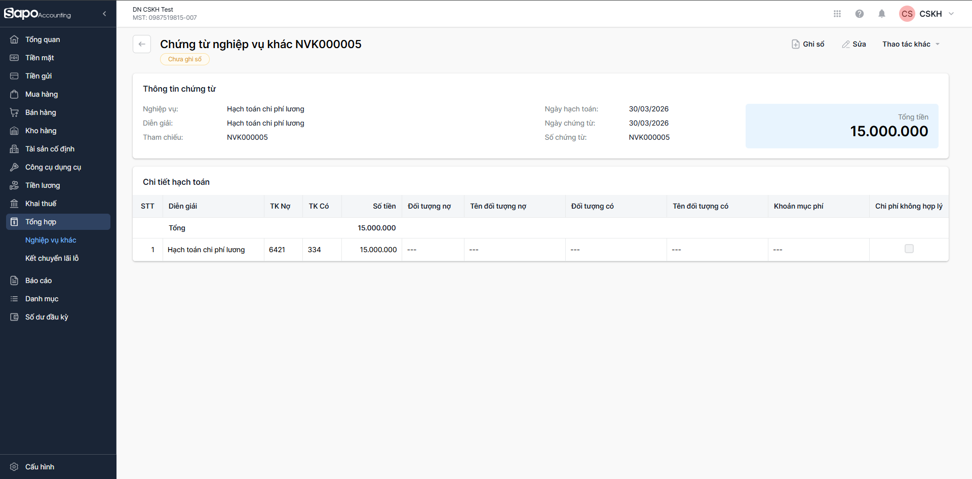 - Ghi sổ: Nhấp vào nút Ghi sổ nếu chứng từ đang ở trạng thái Chưa ghi sổ.