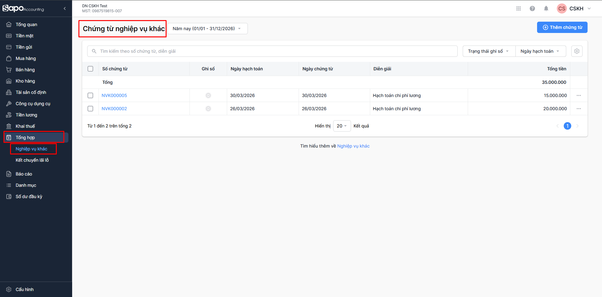 - Trên thanh menu bên trái trang quản trị, chọn Tổng hợp > Nghiệp vụ khác, phần mềm sẽ điều hướng đến màn hình Chứng từ nghiệp vụ khác.