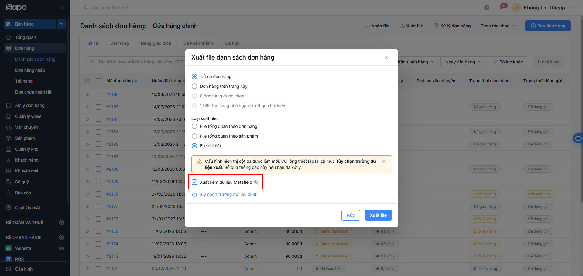 - Nếu cửa hàng của bạn có tạo thêm các trường thông tin mở rộng (Metafields) để quản lý đơn hàng theo đặc thù riêng, bạn có thể xuất các dữ liệu này ra file báo cáo.
